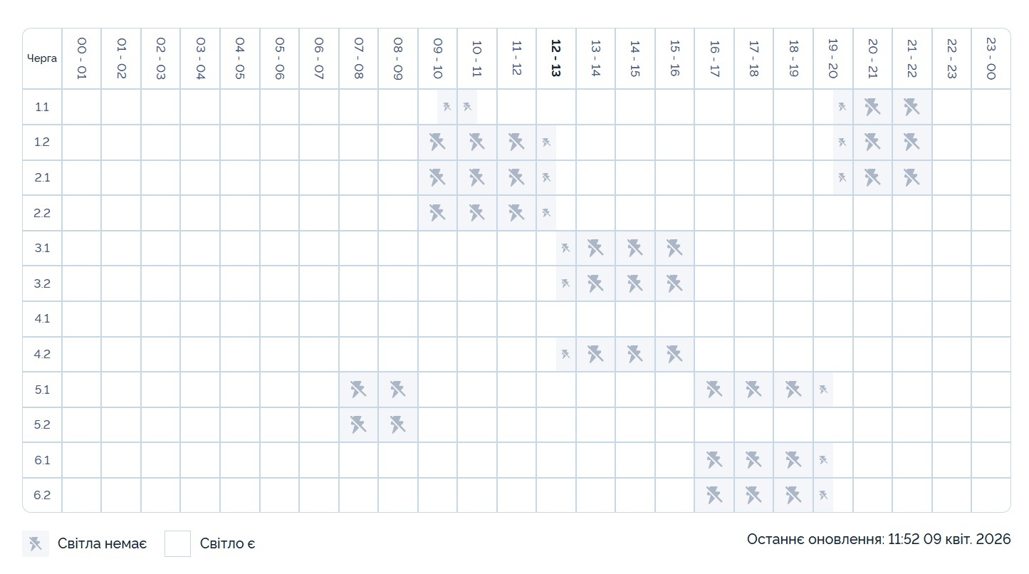 Во всех регионах Украины 9 апреля с 07:00 до 22:00 вынуждено применяются графики почасовых отключений света. Об этом сообщили в “Укрэнерго”.