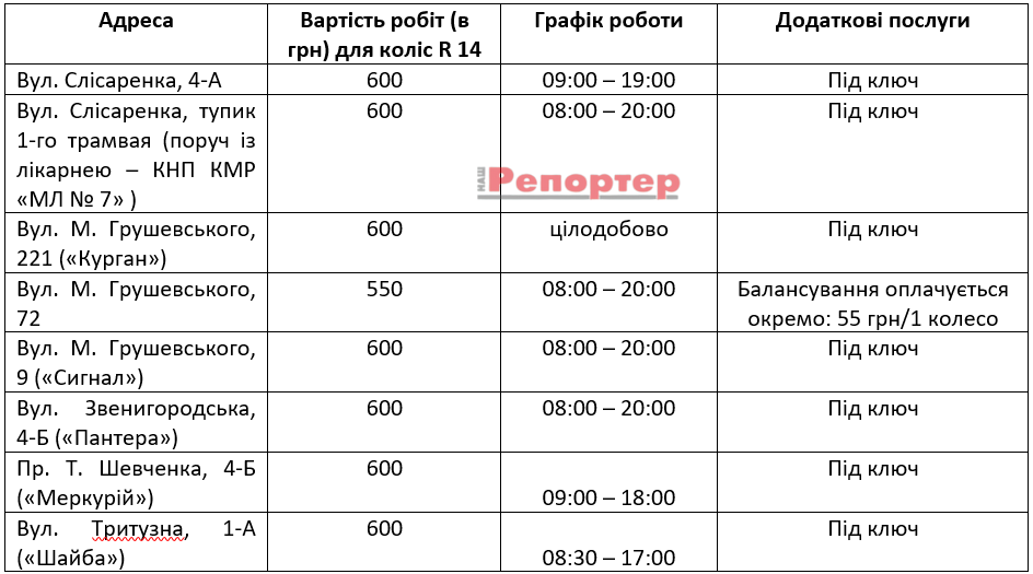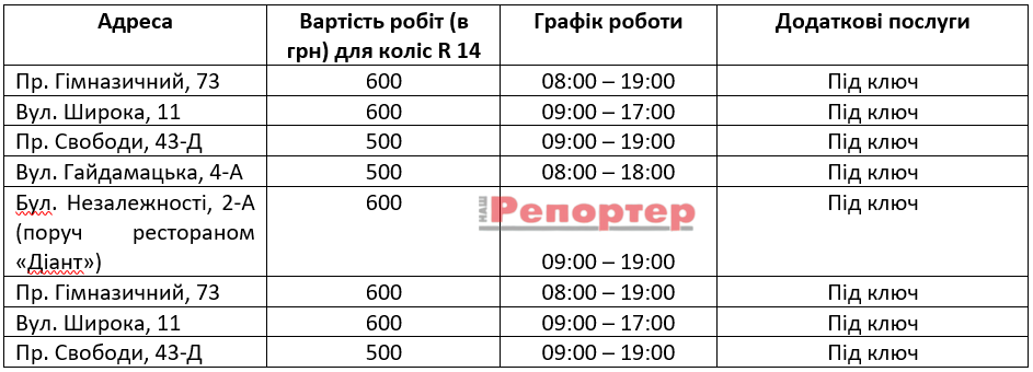 Ми зібрали перелік шиномонтажних станцій у різних районах міста із зазначенням вартості послуг за сезонну заміну шин та режиму роботи. З’ясовували ціну за 4 колеса R 14 – найпоширеніших розмірів шин легкових автомобілів. Відповідно, для шин більшого діаметру ціна поступово буде збільшуватися.