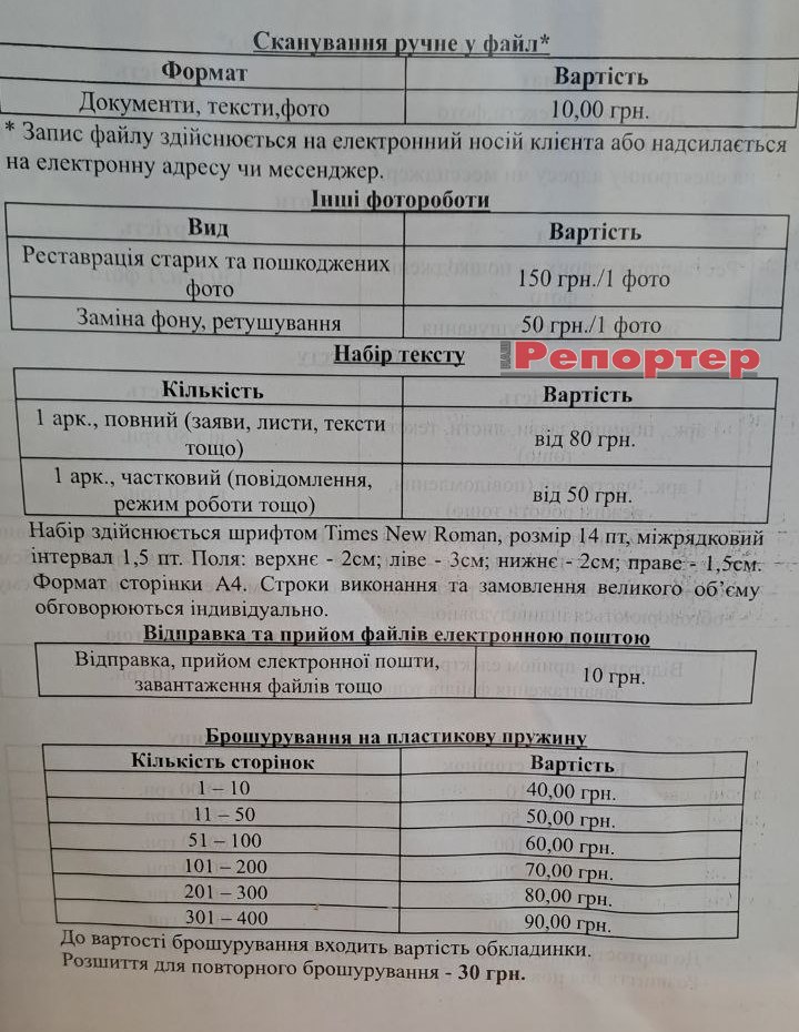 Тут можна роздрукувати з флешки готові тексти, документи та фотографії – у кольорі або чорно-білі, замовити набір тексту. Набраний або відсканований матеріал, за бажанням замовника, може бути роздрукований, надісланий на електронну пошту, у месенджер або записаний на наданий носій.