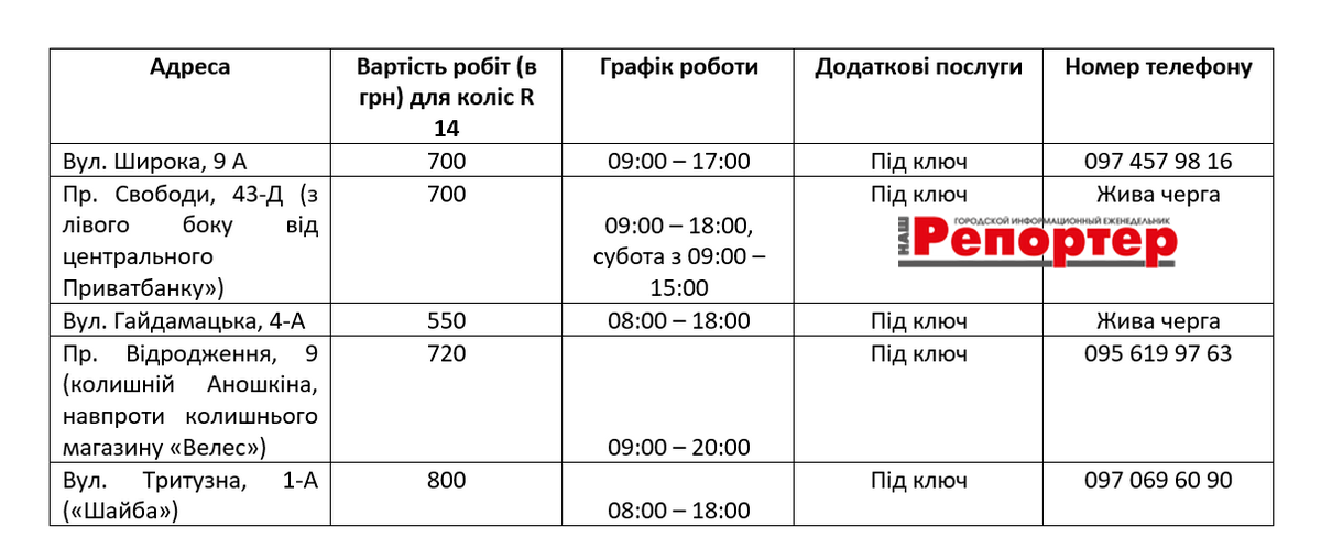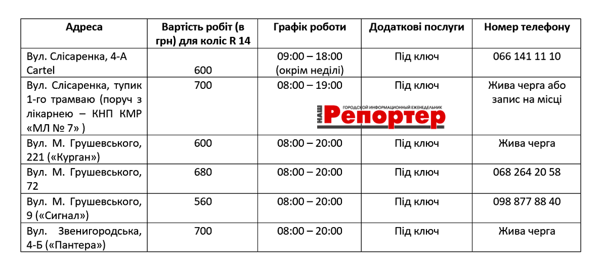 Журналісти зібрали перелік шиномонтажних станцій у різних районах міста із зазначенням вартості послуг, режиму роботи та номерів телефонів (за наявності).