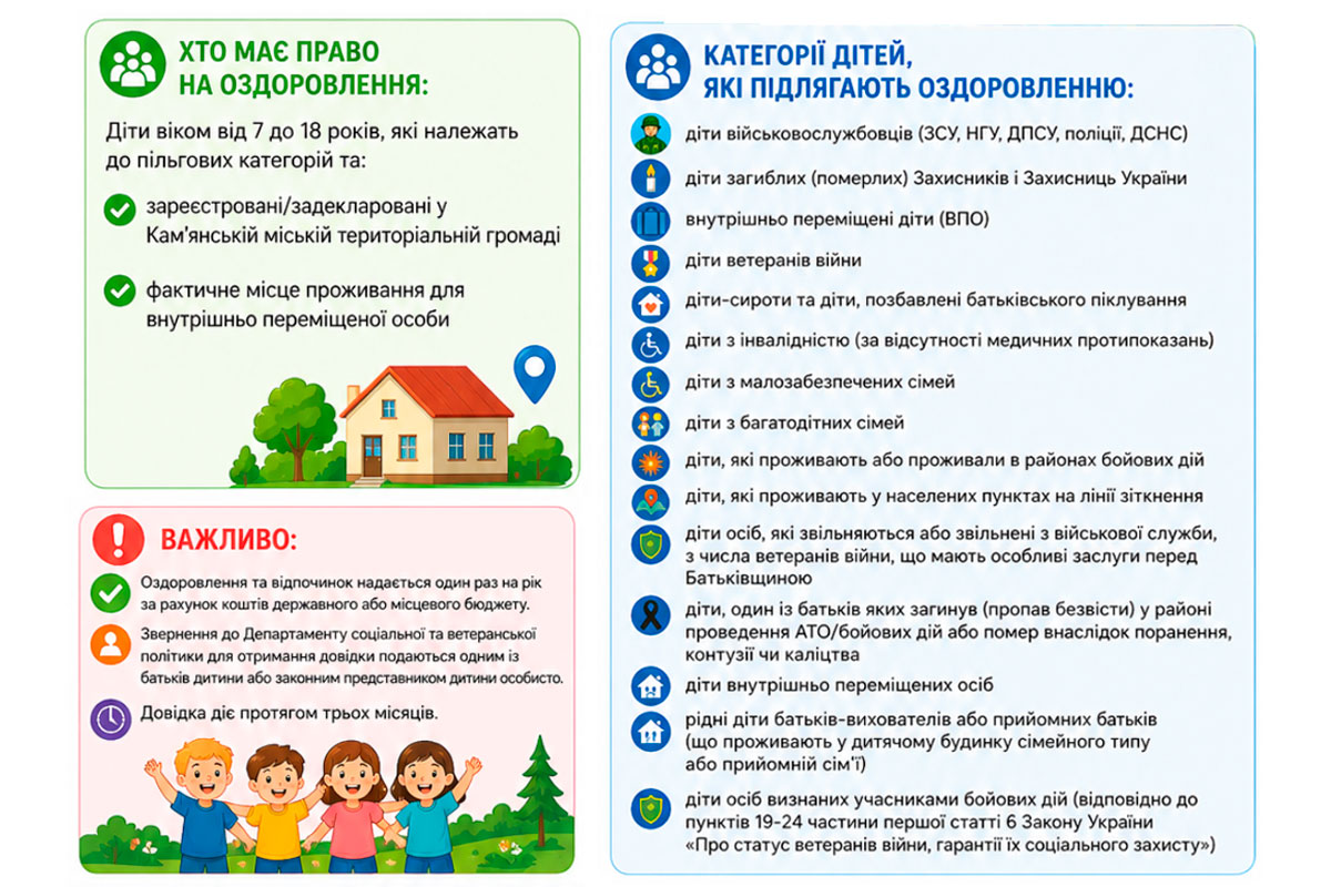 До уваги мешканців Кам’янського: безкоштовне оздоровлення та відпочинок дітей у 2026 році (хто має право та як оформити)