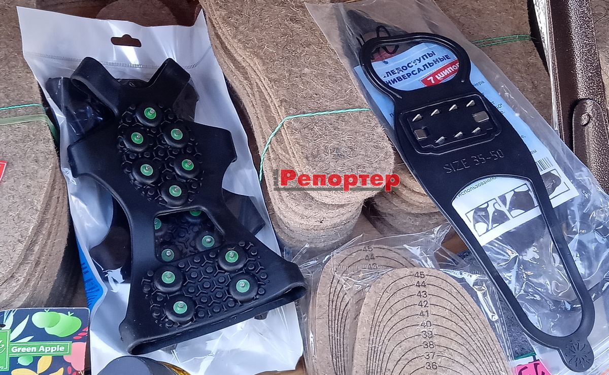 Про засоби від ожеледиці, які дозволяють пересуватися без ризику впасти, ми писали тут. Знайти фабричні льодоступи в магазинах Кам’янського тоді не вдалося. Але я побачила цей корисний пристрій сьогодні, 21 лютого, на центральному ринку, в кіоску з усілякими дрібницями, необхідними в господарстві, зокрема з різноманітними устілками для взуття. Тут є два види гумових накладок із шипами.