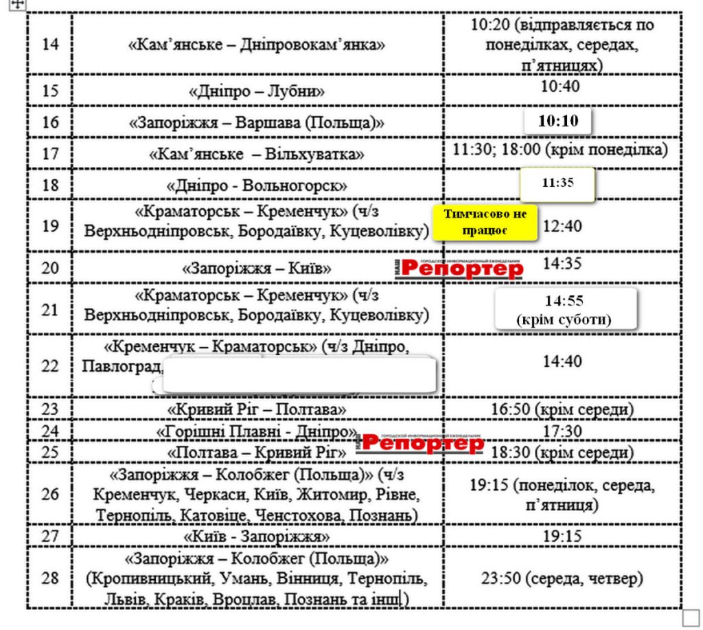 “Кременчук – Краматорськ” відправленням з АС-1 Кам’янського о 14:40;