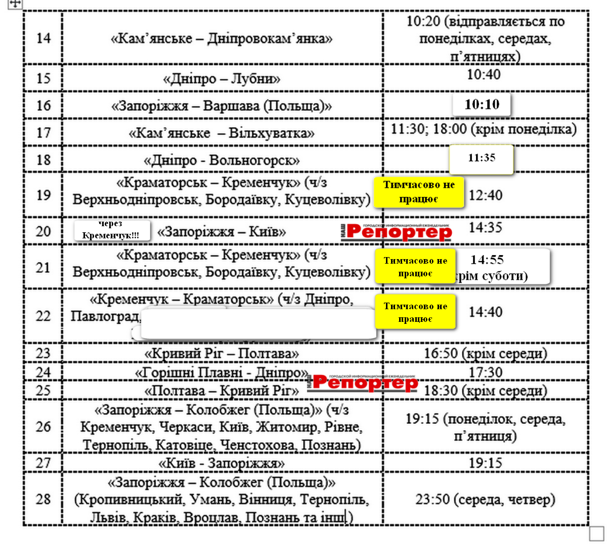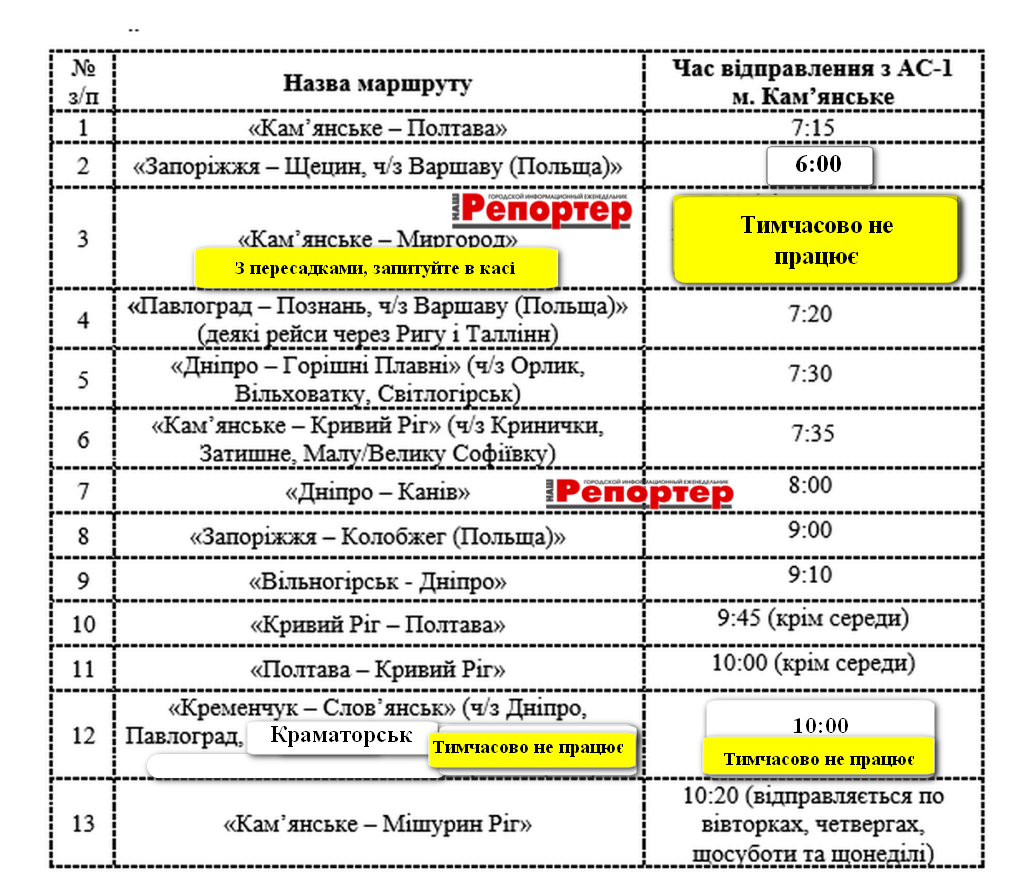 «Краматорськ – Кременчук» відправленням з АС-1 Кам’янського о 14:55 (щодня, окрім суботи).