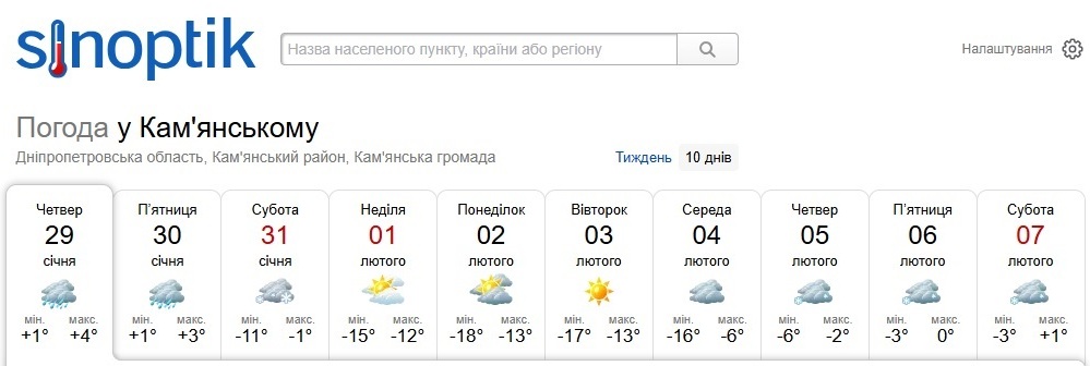 Сайт Sinoptik.ua повідомляє, що у Кам’янському весь майбутній тиждень буде морозним. Найхолоднішими будуть неділя, 1 лютого, понеділок, вівторок та середа. До -18 градусів уночі та -13 вдень. У четвер мороз ослабне до -6 градусів уночі та -2 градусів вдень.