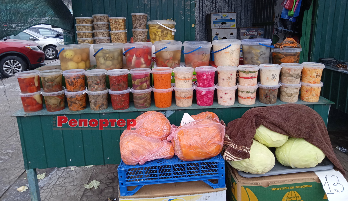 На ринку хвалять квашені та мариновані овочі, приготовлені у селі Балівка. Ціни – від 80 грн за упаковку (відерце) квашеної капусти.