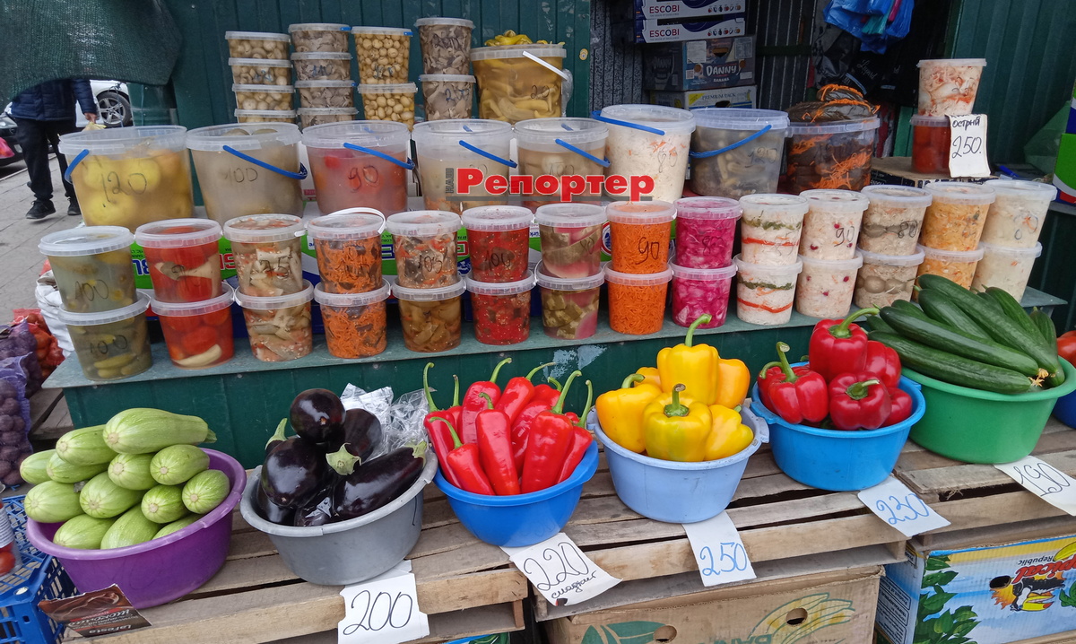 Є гарний вибір квашених овочів із села Балівка. Продавці хвалять, кажуть, що це традиційні (бочкові) заготовки. Ціни – від 70 грн за пластикове відерце квашених помідорів. Відерце квашеної капусти коштує 80 грн. Продають і на вагу.