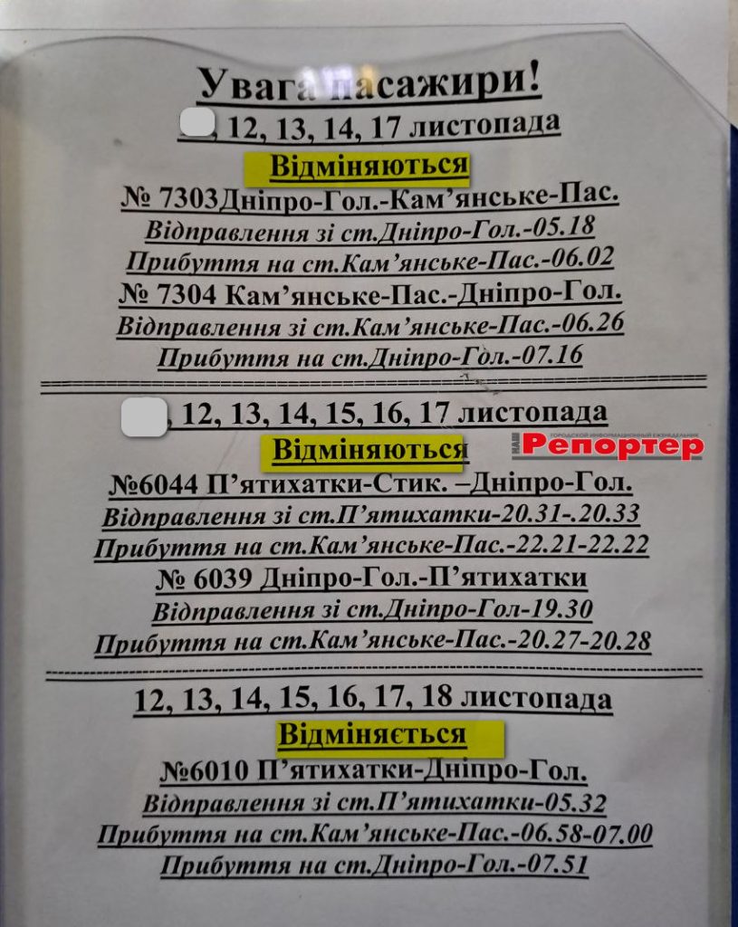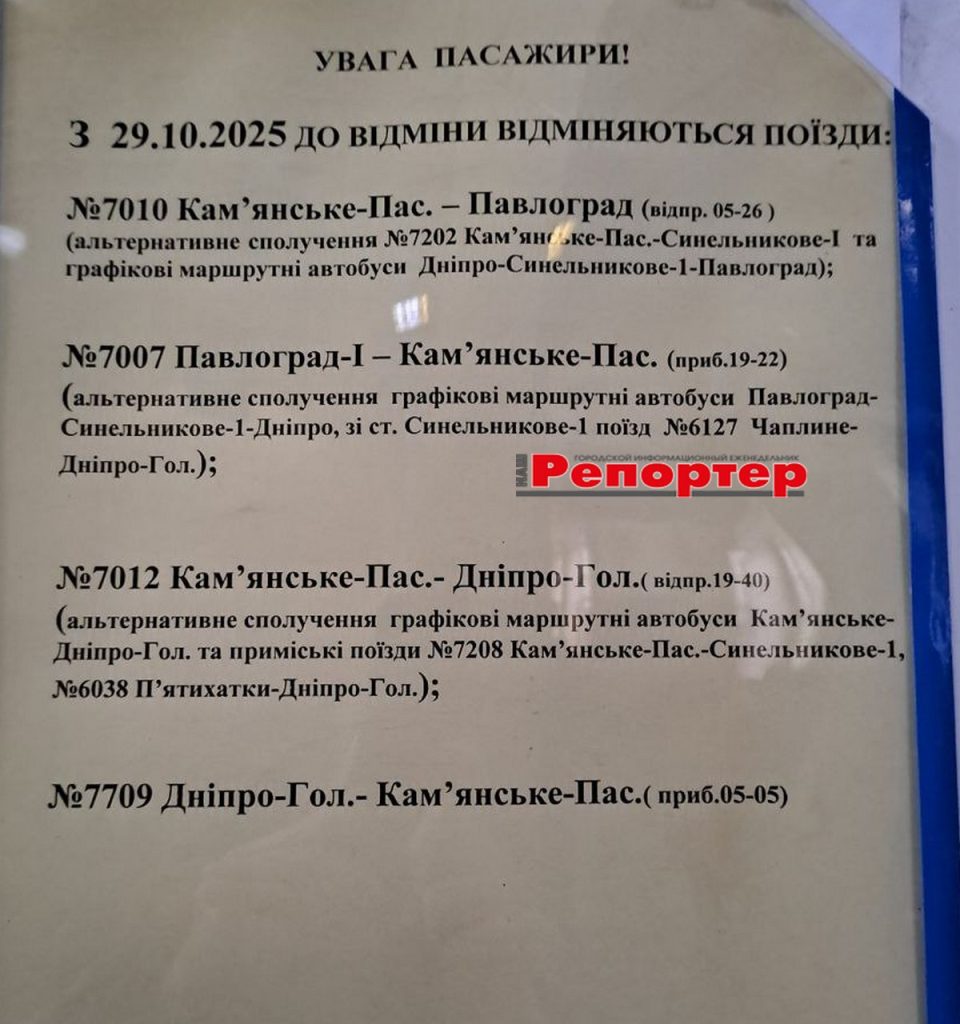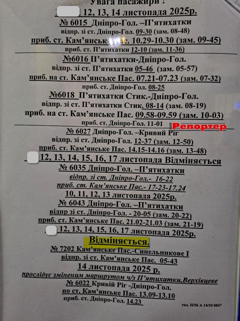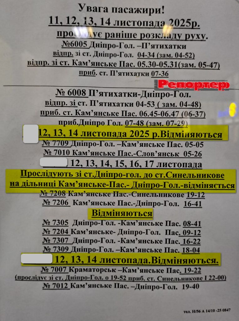 Публікуємо офіційну інформацію (станом на 12 листопада 2025 року), розміщену на залізничному вокзалі Кам’янського. Нагадуємо телефон довідкової: 093-104-70-41.