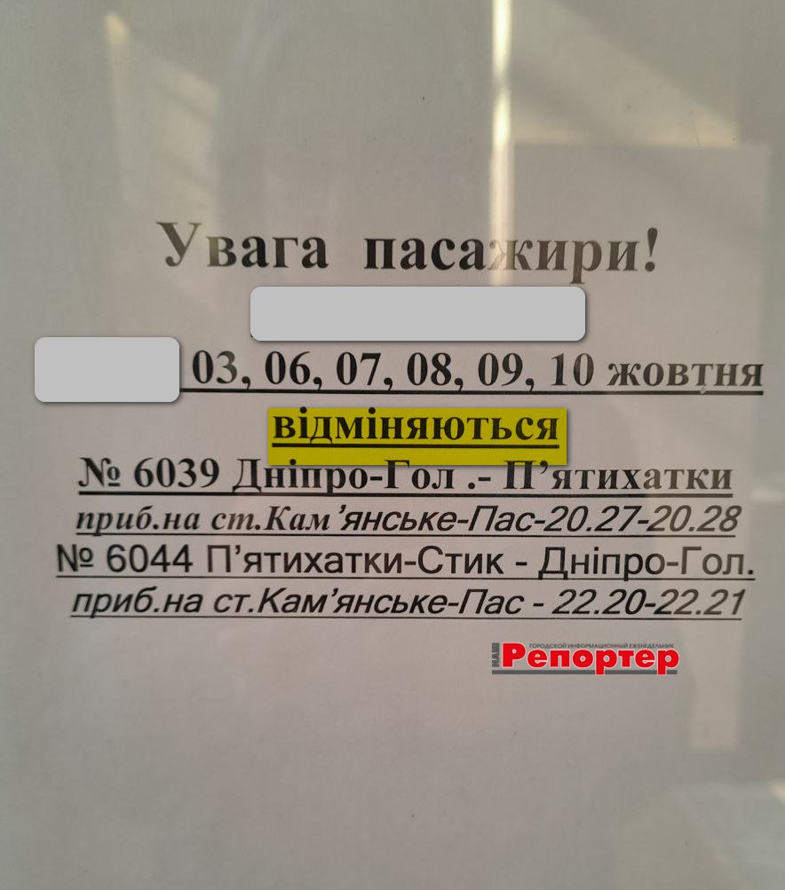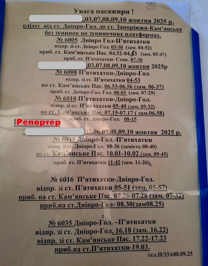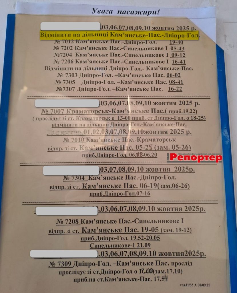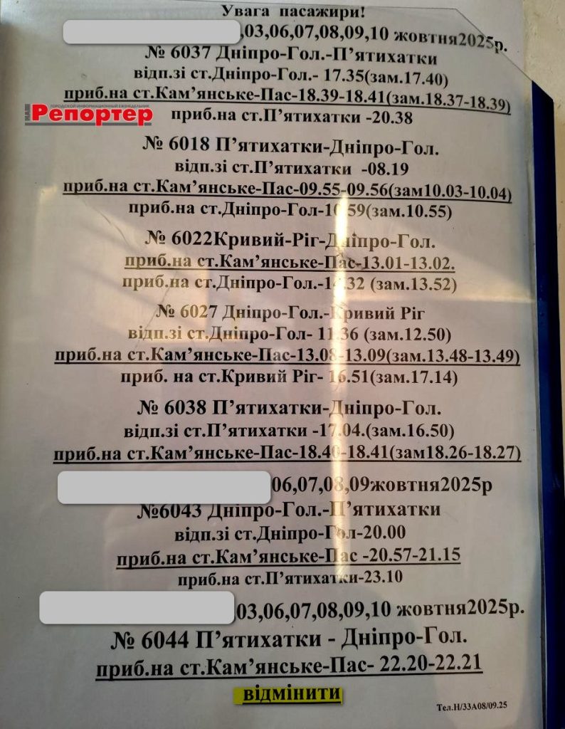 Публікуємо офіційну інформацію (станом на 2 жовтня 2025 року), розміщену на залізничному вокзалі Кам’янського. Нагадуємо телефон довідкової: 093-104-70-41.