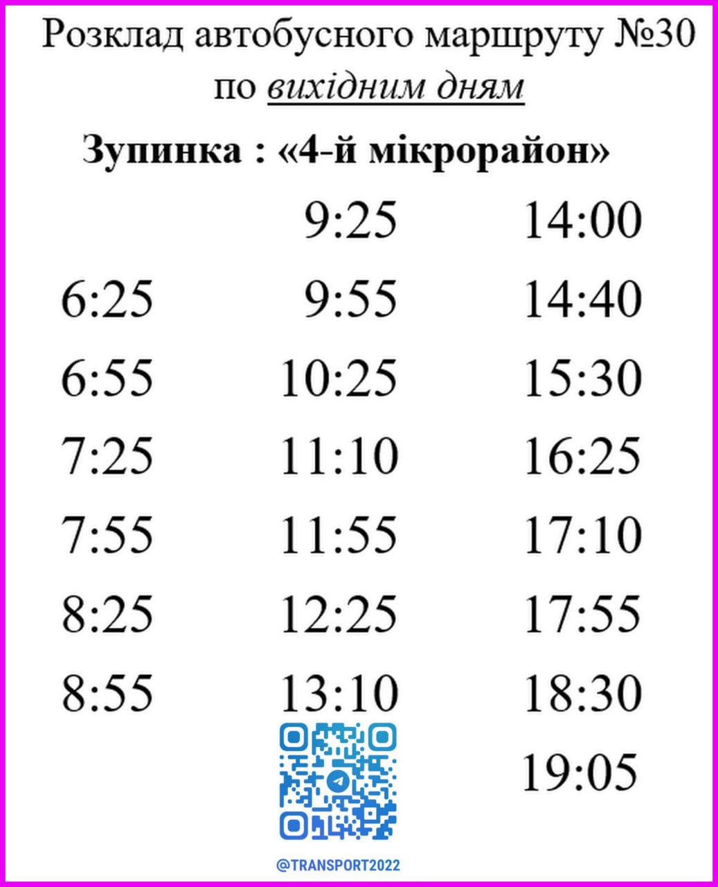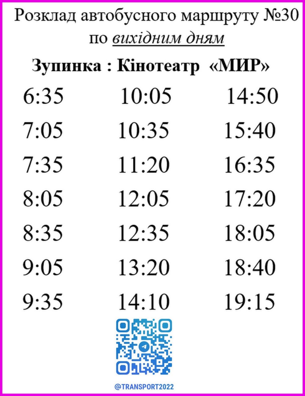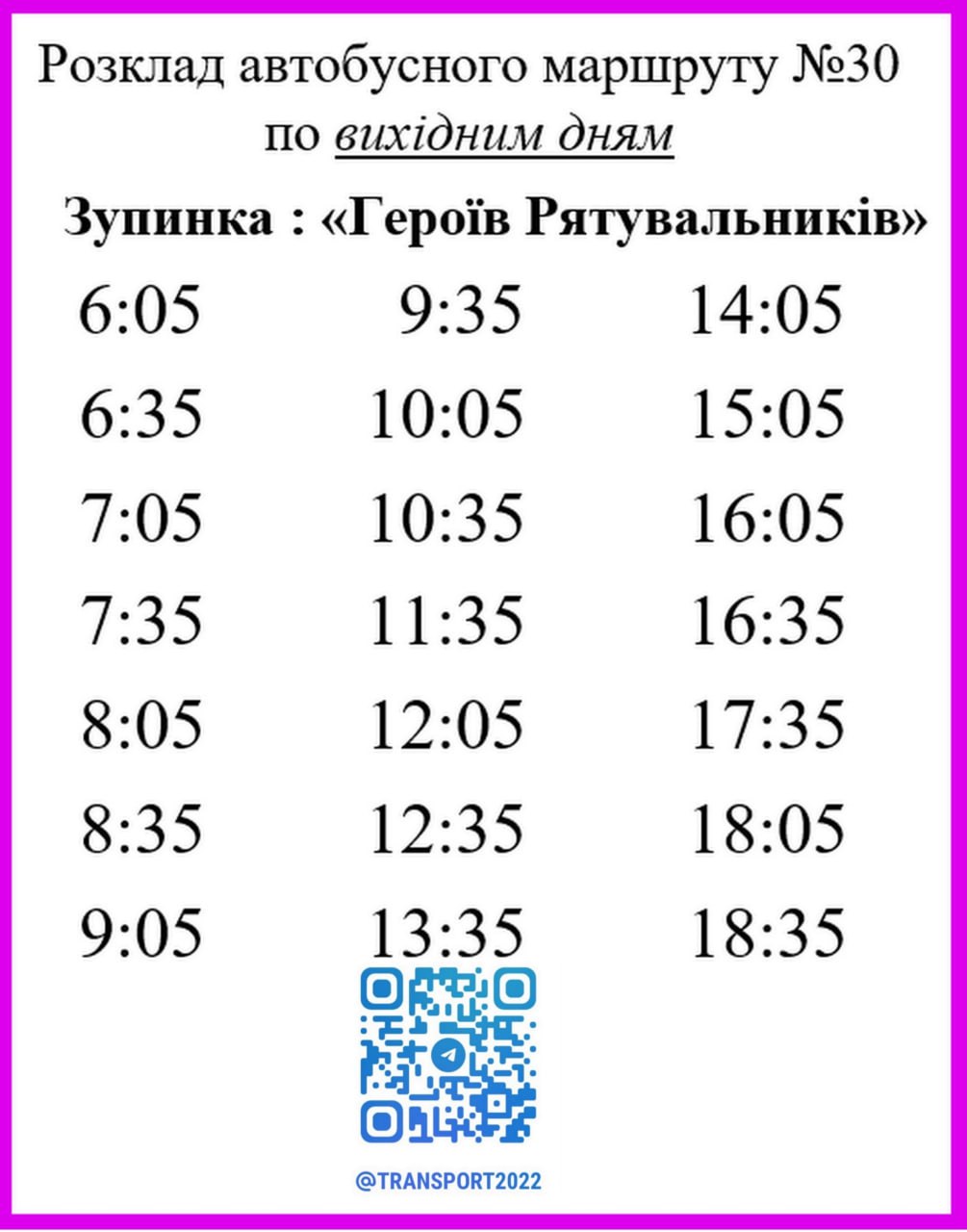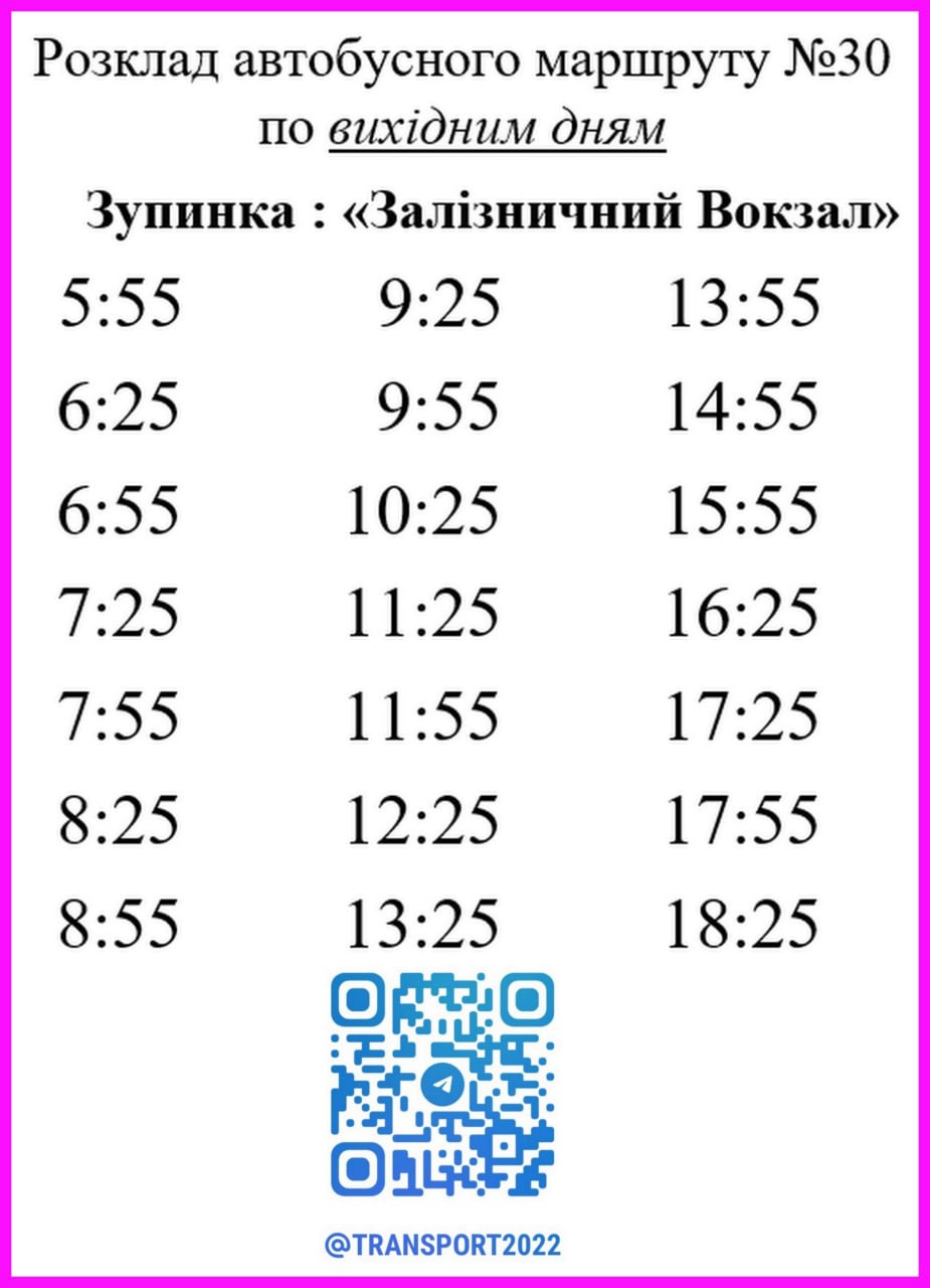 Актуальний розклад для автобусного маршруту № 30 діє у вихідні (в суботу та неділю).
