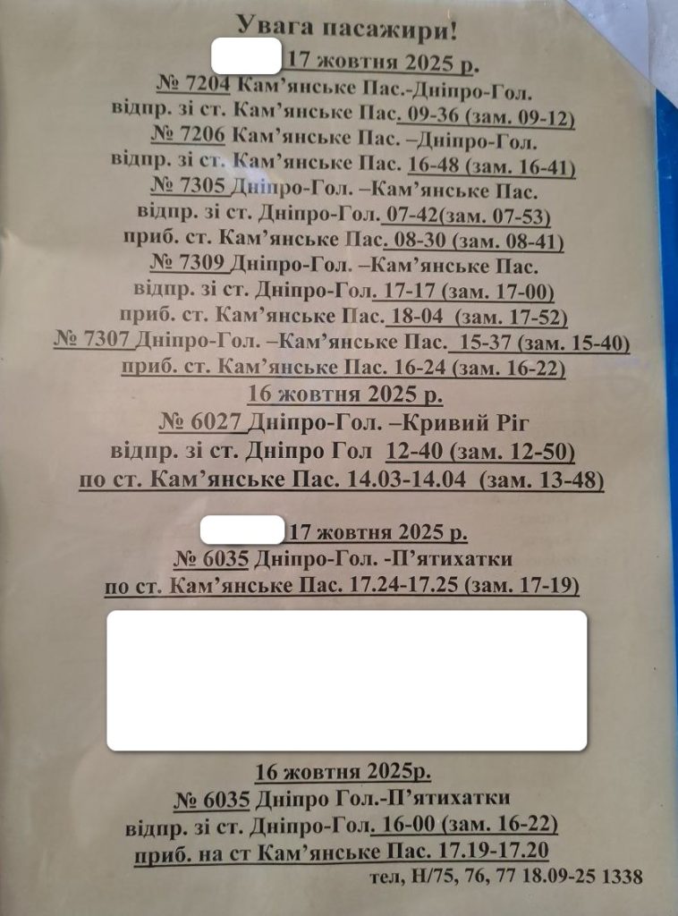 Публікуємо офіційну інформацію (станом на 15 жовтня 2025 року), розміщену на залізничному вокзалі Кам’янського. Нагадуємо телефон довідкової: 093-104-70-41.