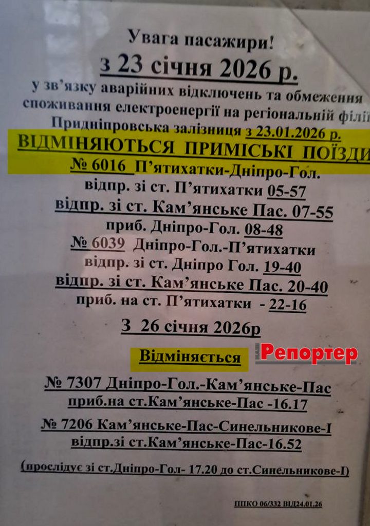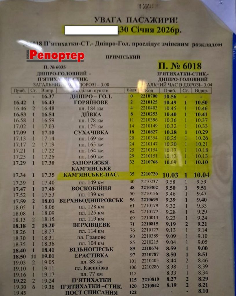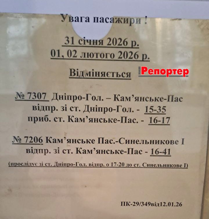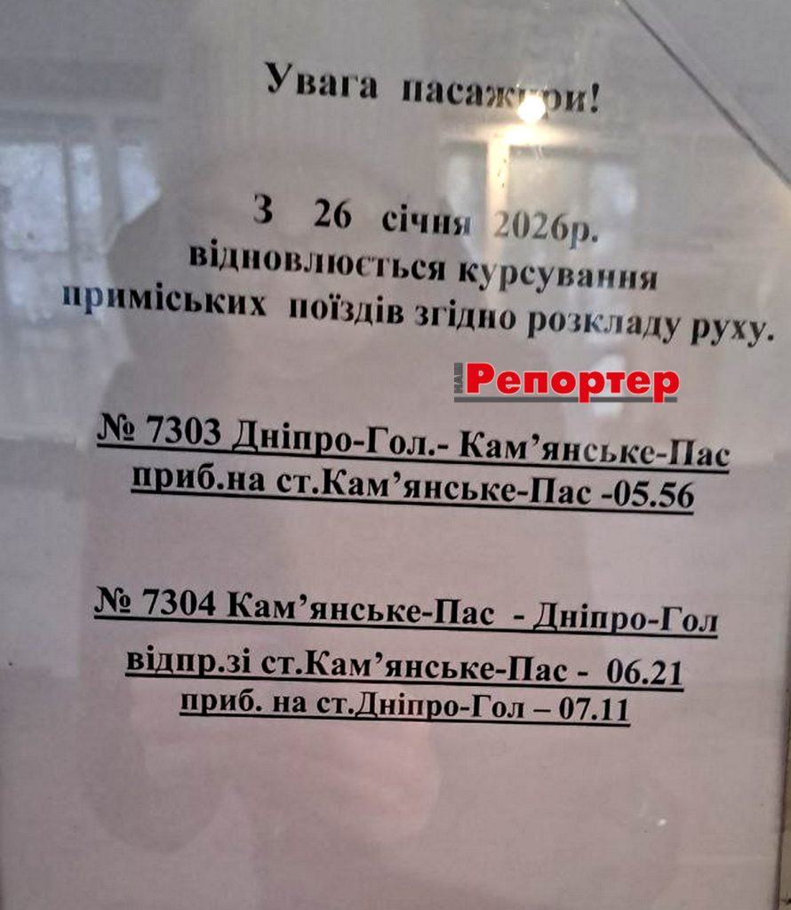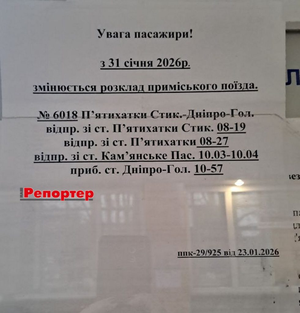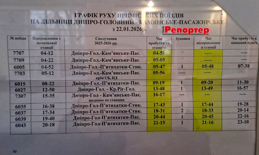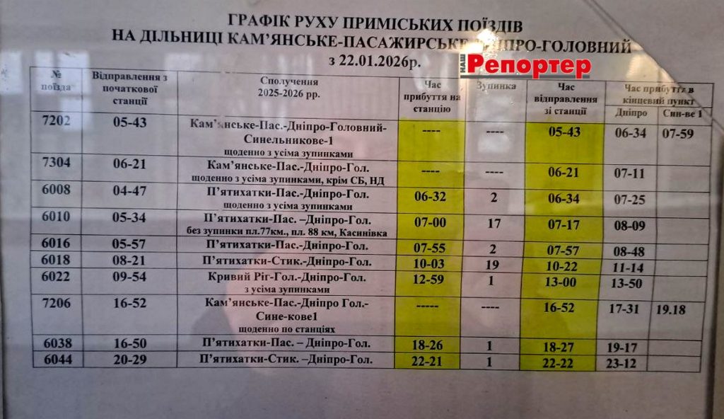 Пасажирам Кам’янського: зміни в розкладі електричок (інформація станом на 30.01.2026)