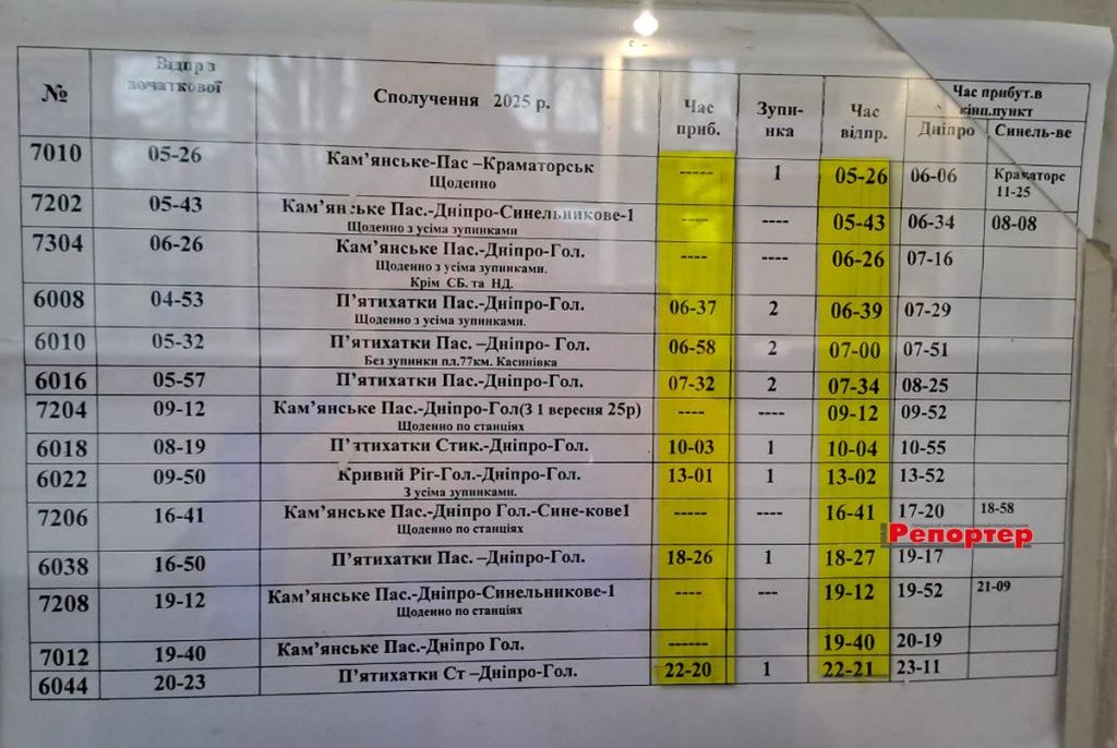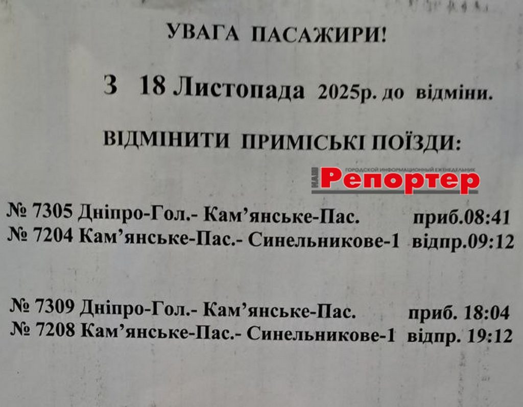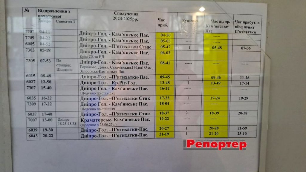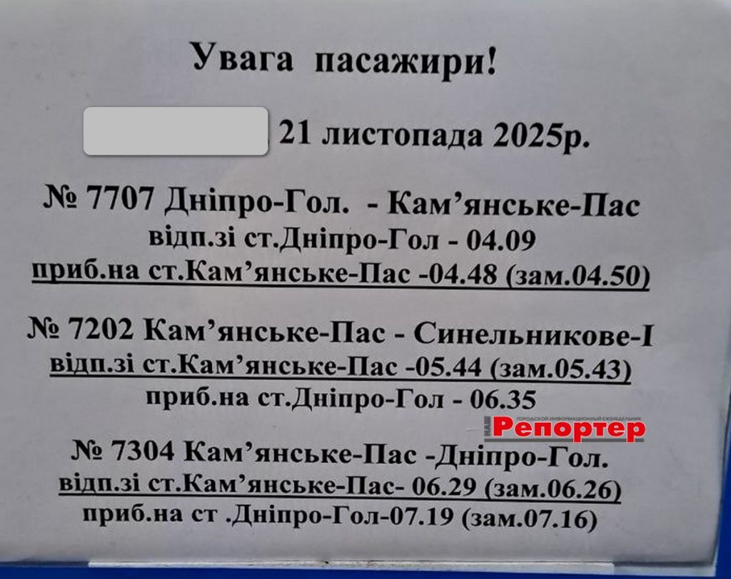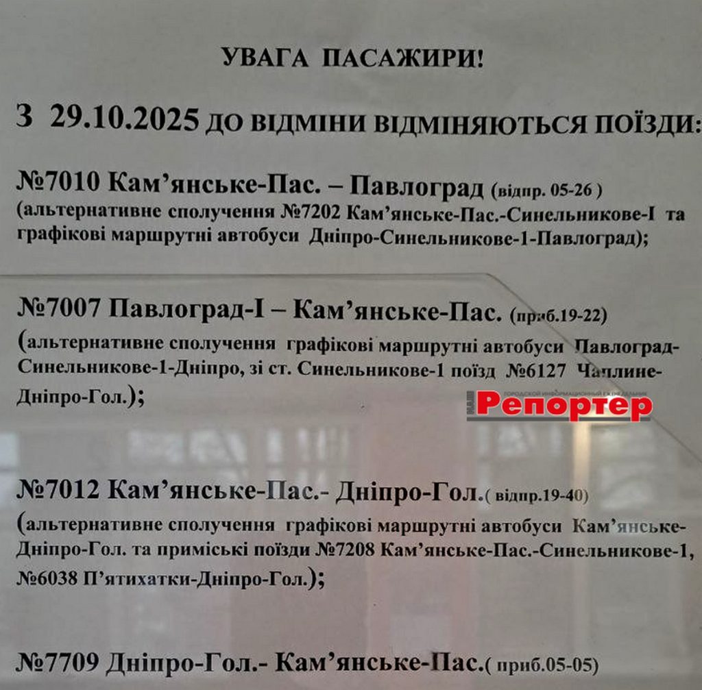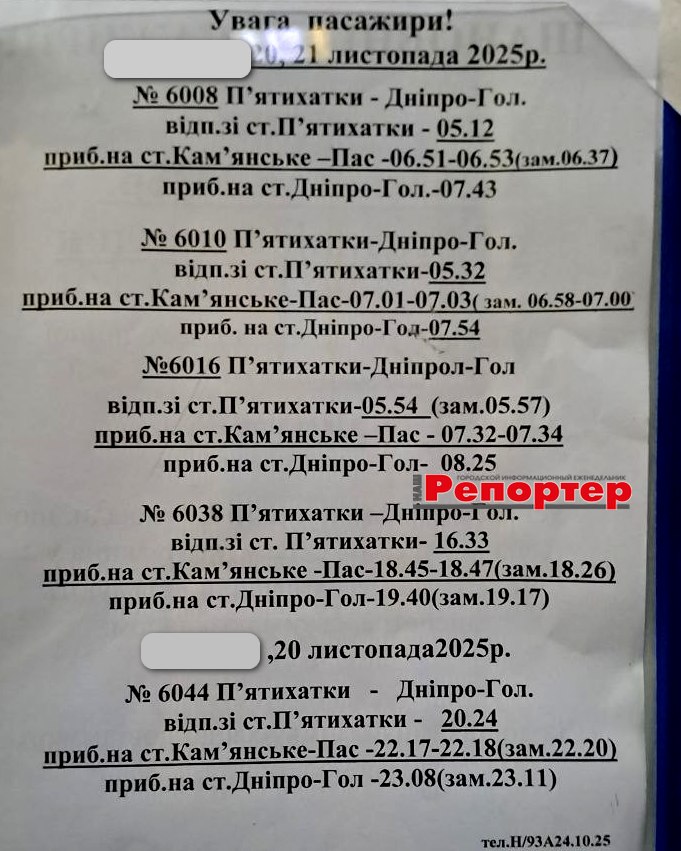 Публікуємо офіційну інформацію (станом на 20 листопада 2025 року), розміщену на залізничному вокзалі Кам’янського. Нагадуємо телефон довідкової: 093-104-70-41.