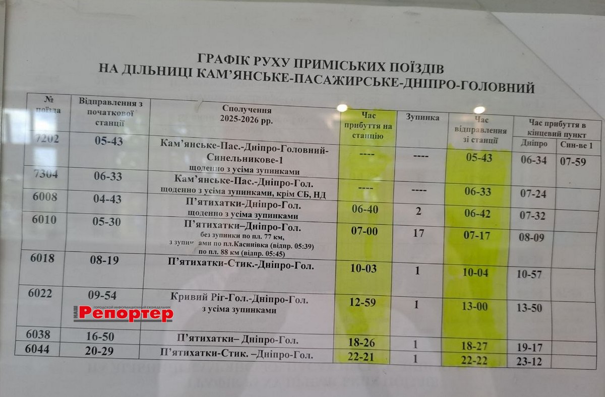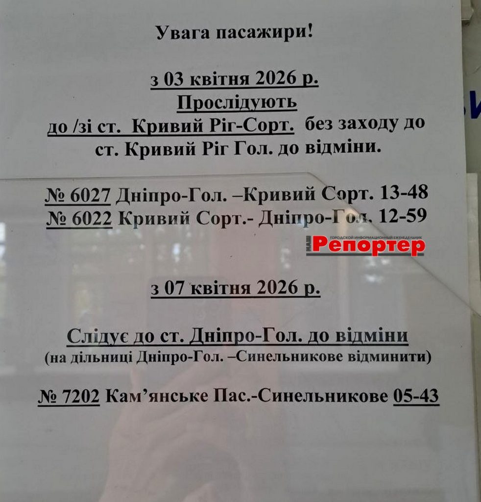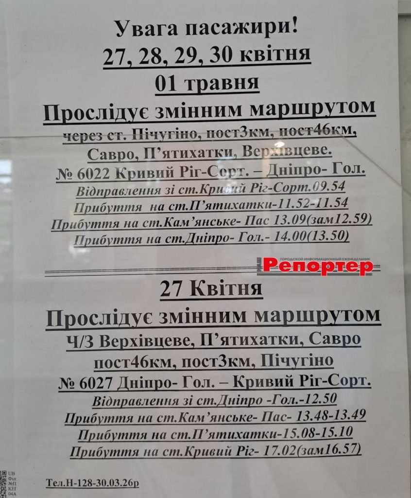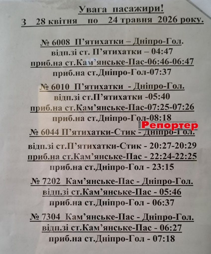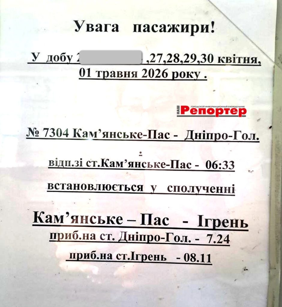 Пасажирам Кам’янського: зміни в розкладі електричок на новий тиждень (інформація станом на 26.04.2026)