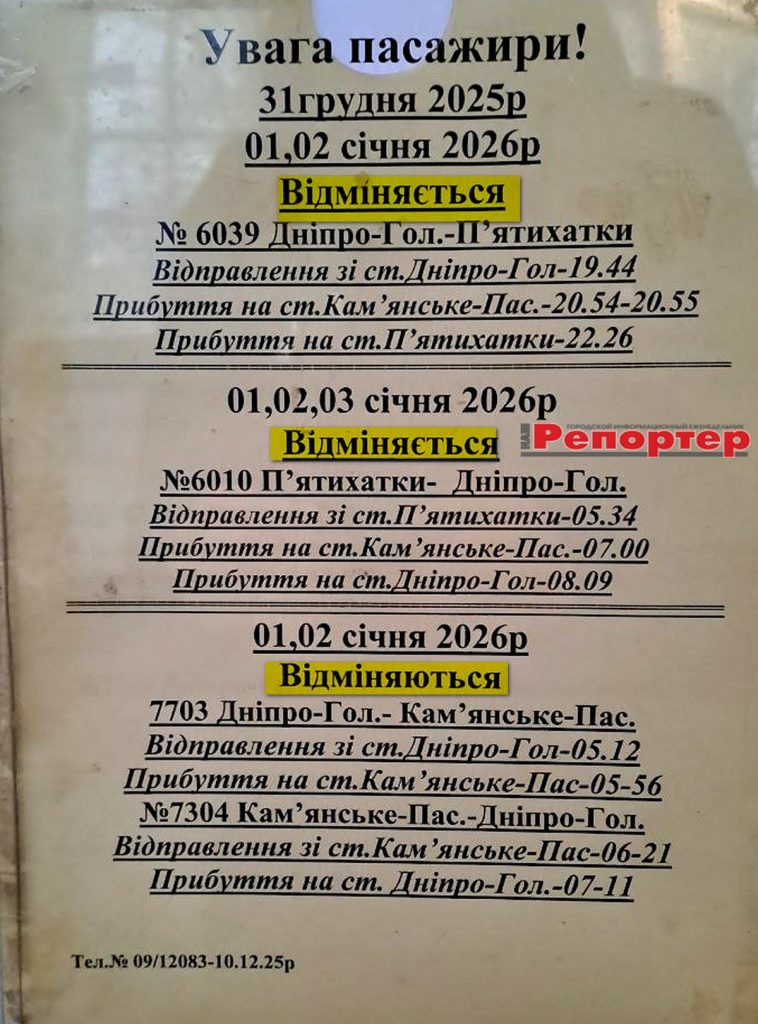 Пасажирам Кам’янського: зміни в розкладі електричок наступного тижня (інформація станом на 28.12.2025)