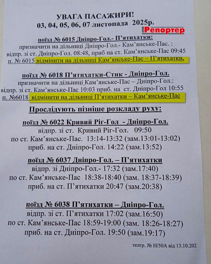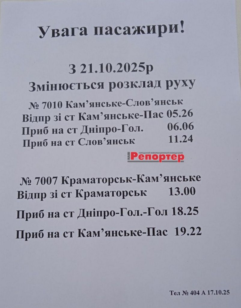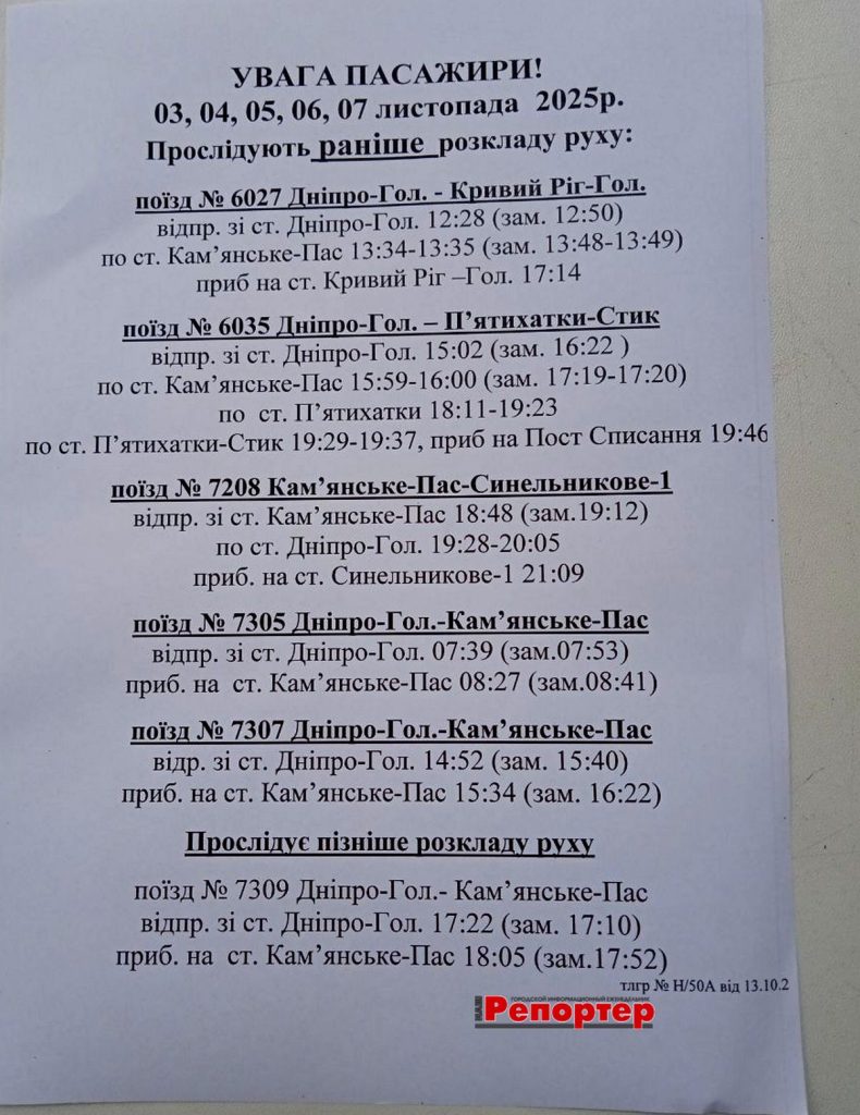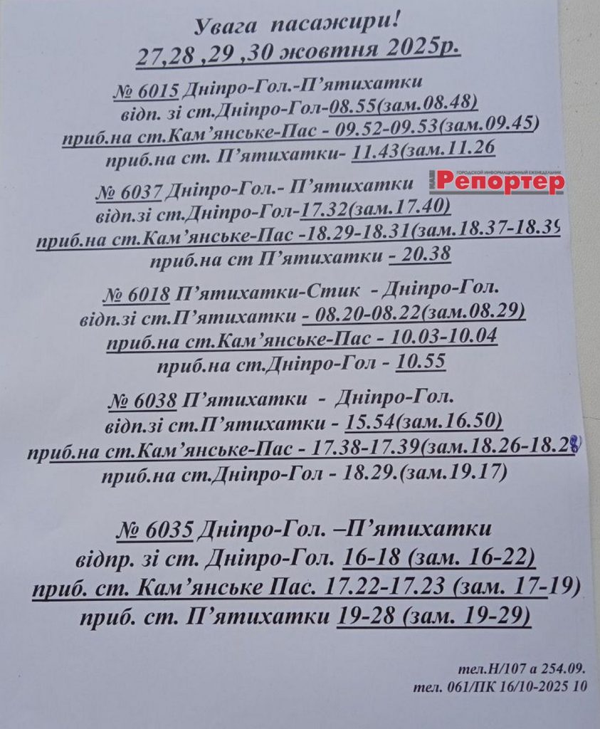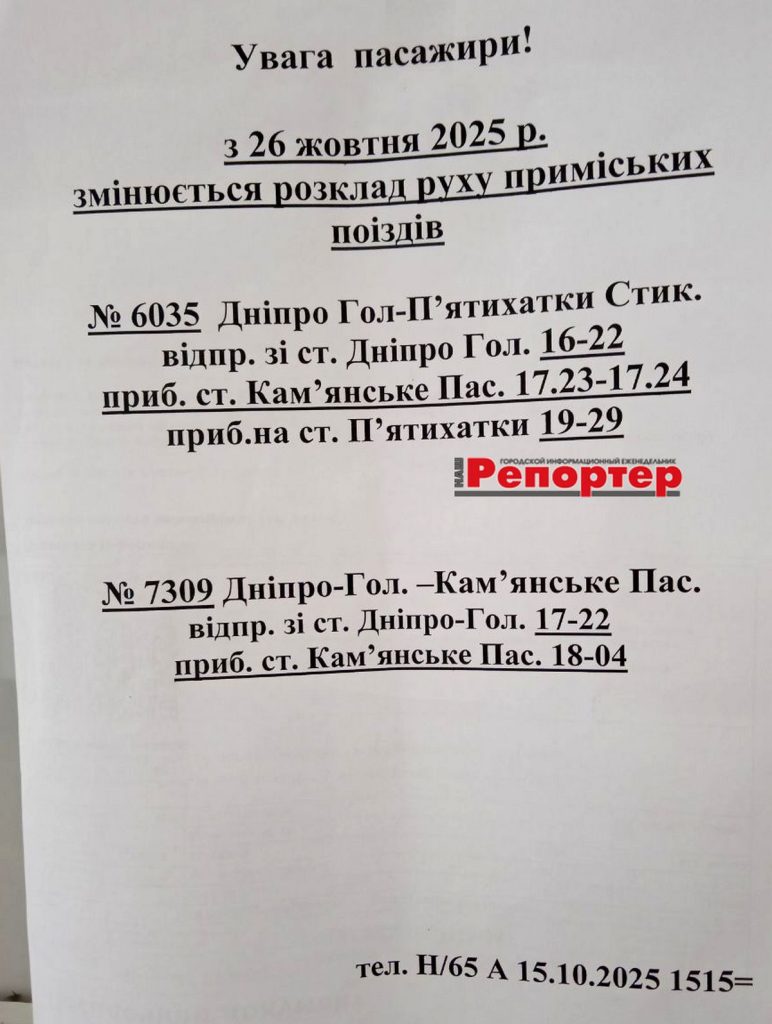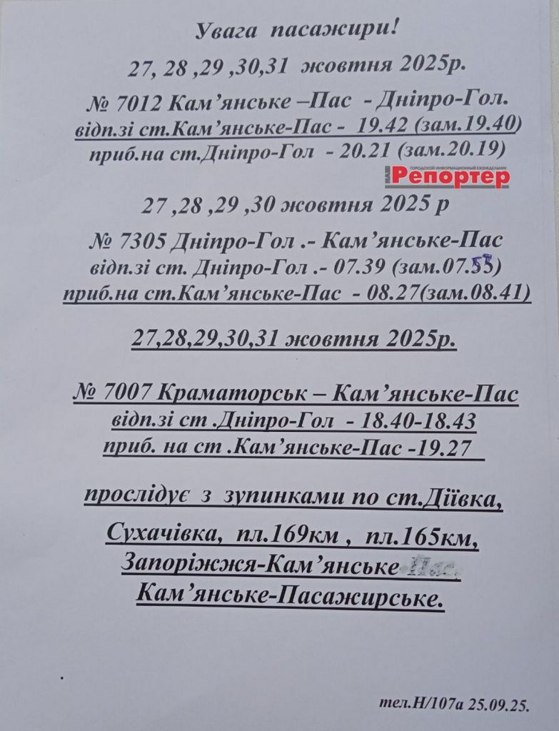 Публікуємо офіційну інформацію (станом на 25 жовтня 2025 року), розміщену на залізничному вокзалі Кам’янського. Нагадуємо телефон довідкової: 093-104-70-41.