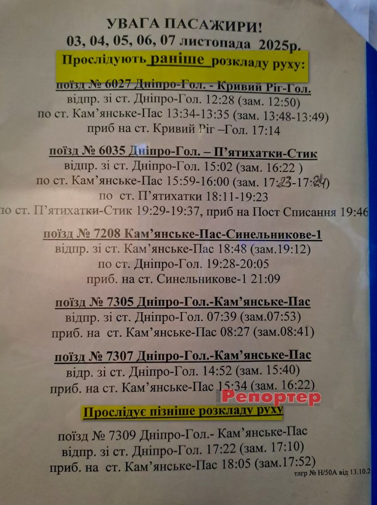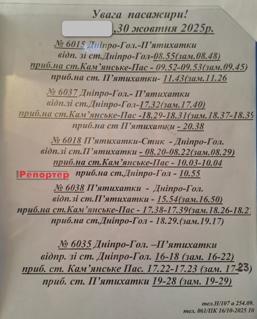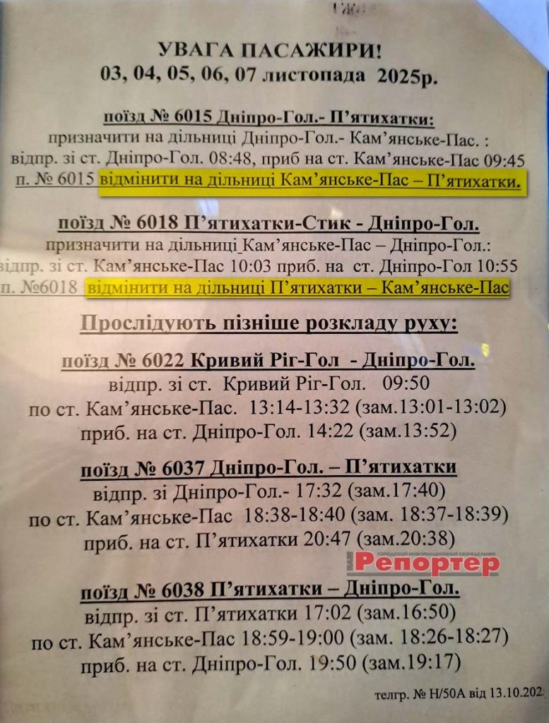 Публікуємо офіційну інформацію (станом на 29 жовтня 2025 року), розміщену на залізничному вокзалі Кам’янського. Нагадуємо телефон довідкової: 093-104-70-41.