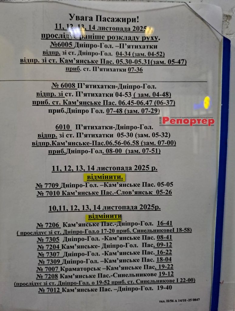 Публікуємо офіційну інформацію (станом на 5 листопада 2025 року), розміщену на залізничному вокзалі Кам’янського. Нагадуємо телефон довідкової: 093-104-70-41.