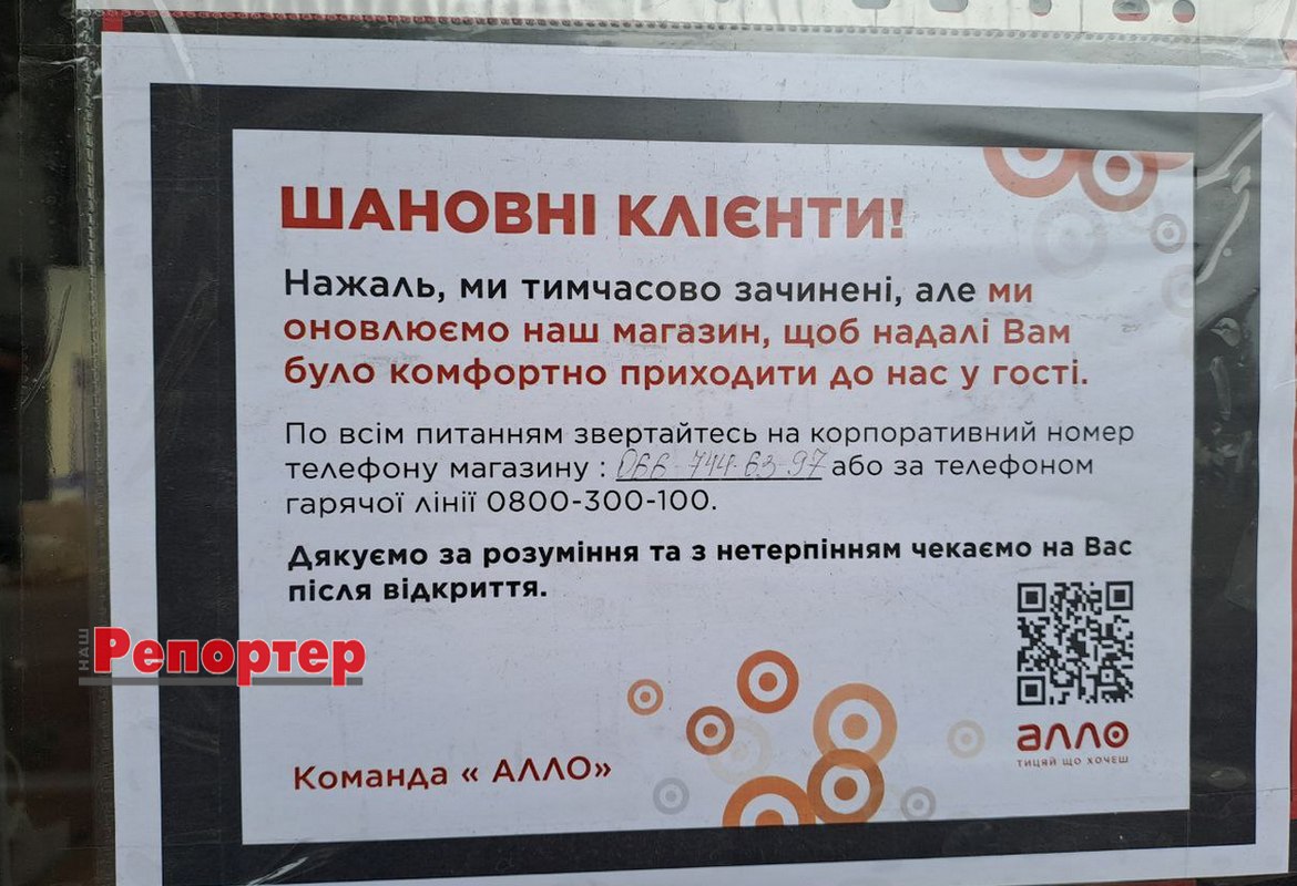 Сьогодні, 30 вересня, журналіст нашої редакції, вирішивши забігти до магазину «АЛЛО», що на проспекті Свободи, 51 (будинок зі шпилем), виявив, що двері замкнені, а на них висить це оголошення.