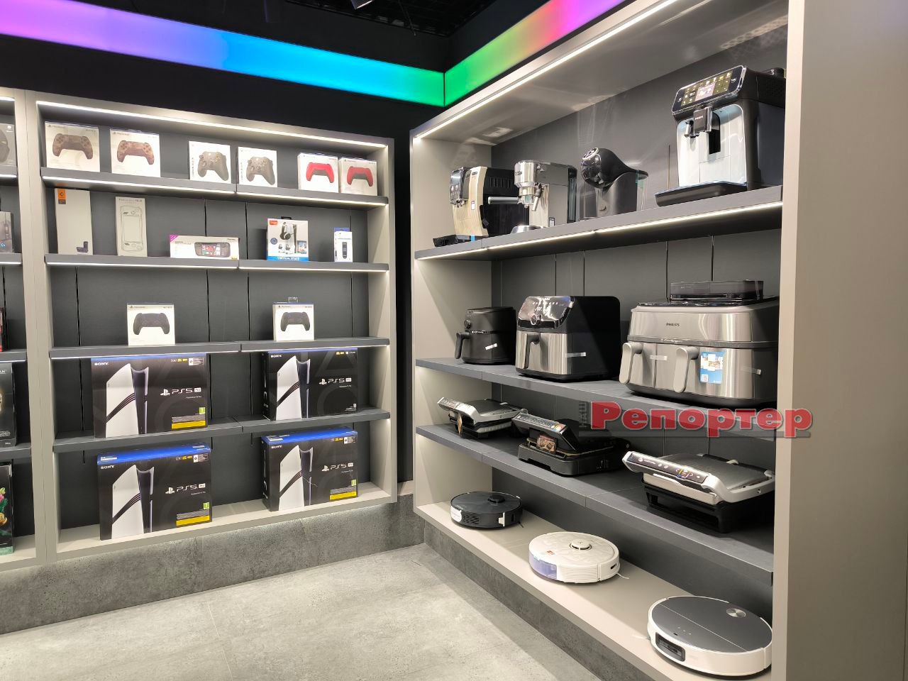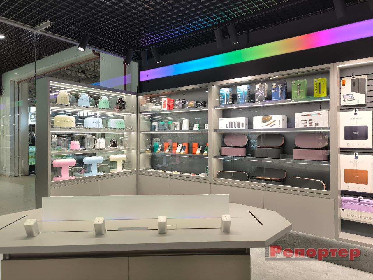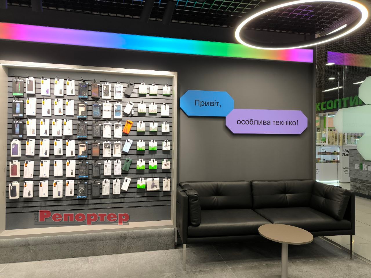 Новий магазин має стильний інтер’єр, тут доволі просторо. Сучасний дизайн із неоновим підсвічуванням створює приємну атмосферу. Товари розміщені у відкритому доступі, тому їх можна роздивитися ближче. Також є можливість протестувати ґаджети перед покупкою.