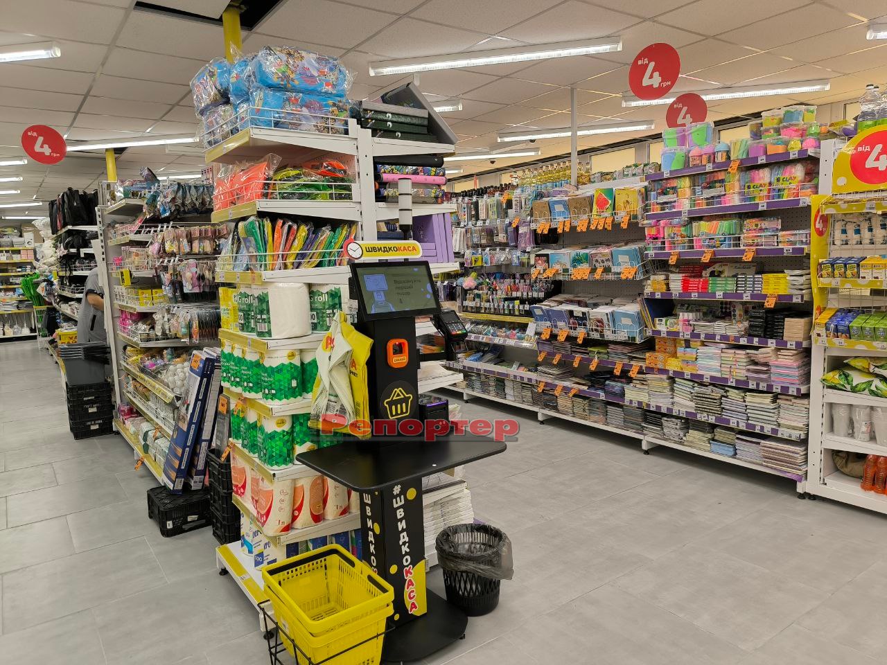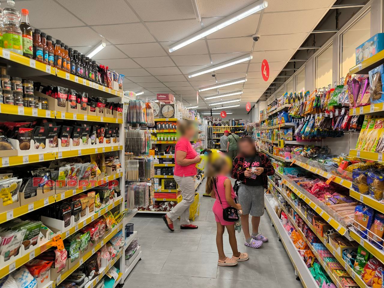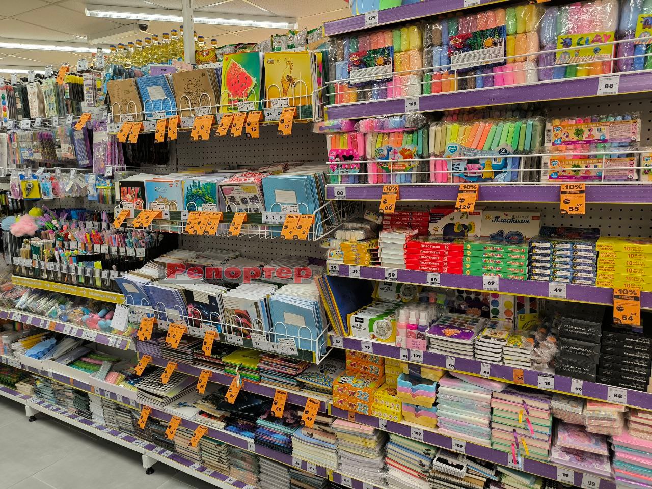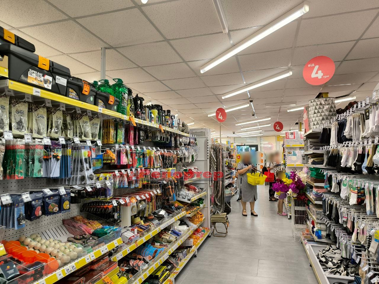 На полицях представлений стандартний набір товарів, який є в крамницях цієї мережі: продукти харчування та напої, канцтовари (актуально перед початком нового навчального року), побутова хімія, зоотовари, посуд, інструменти, техніка, іграшки, аксесуари тощо.