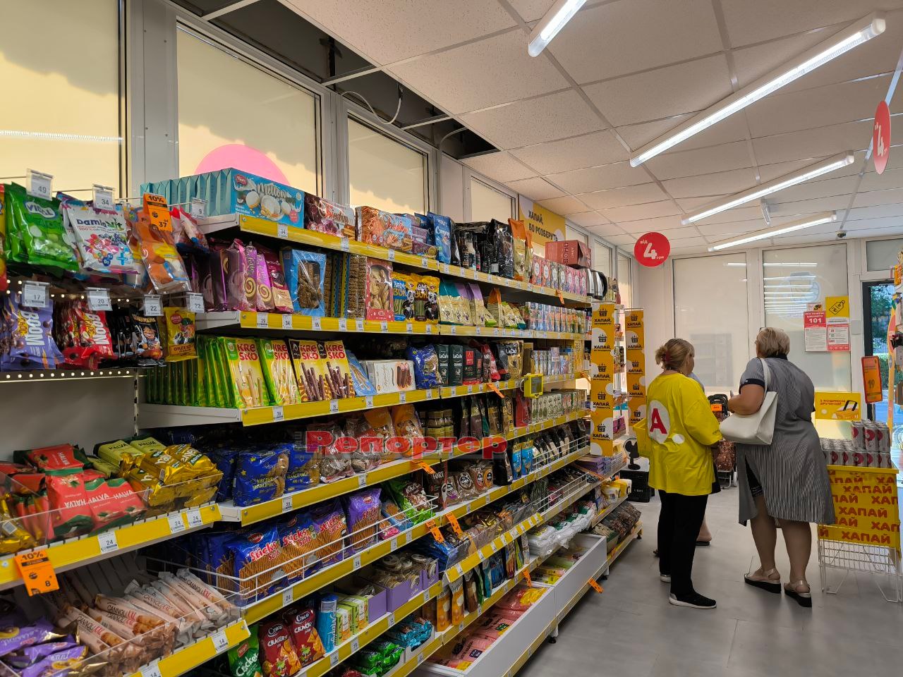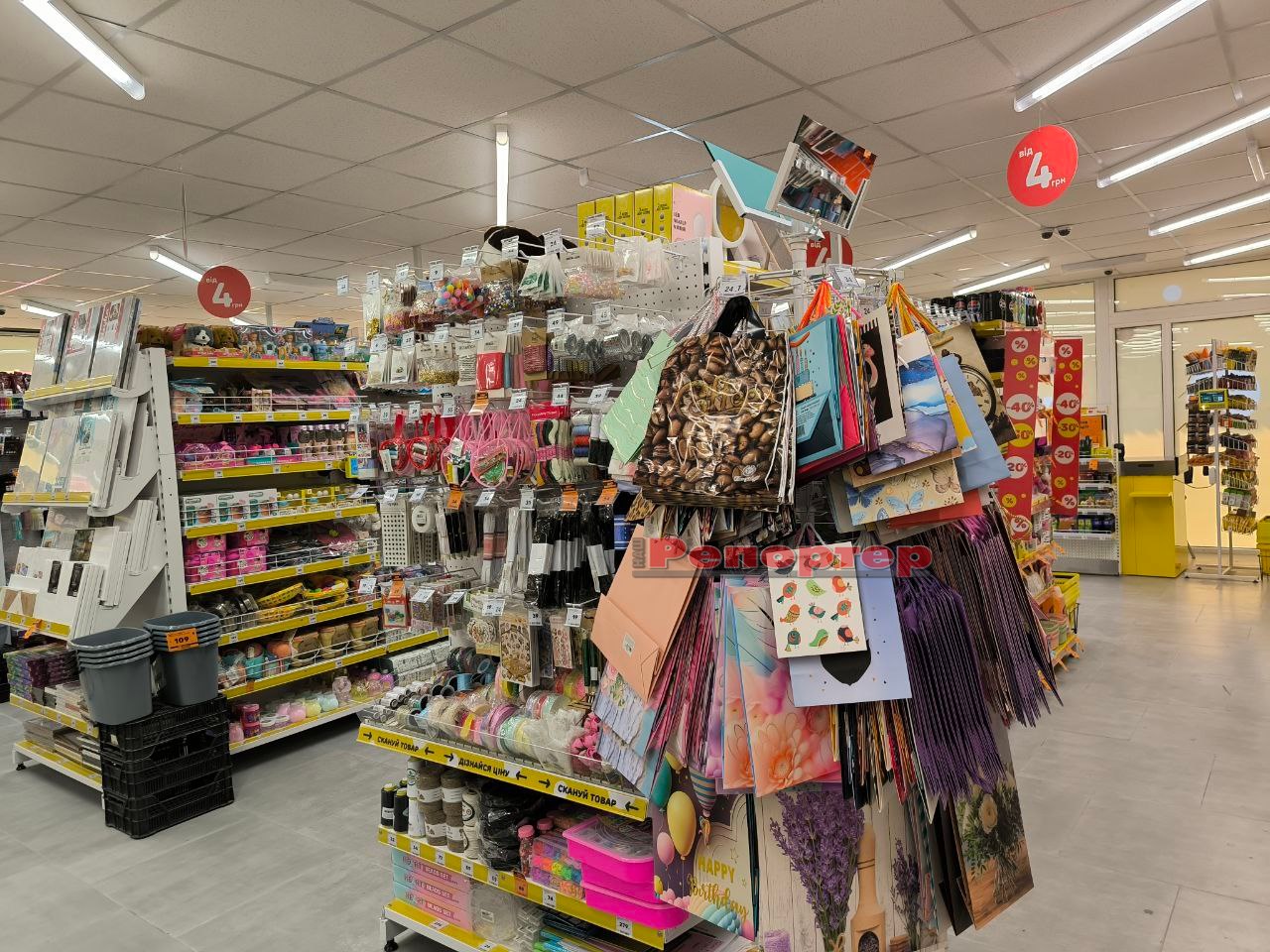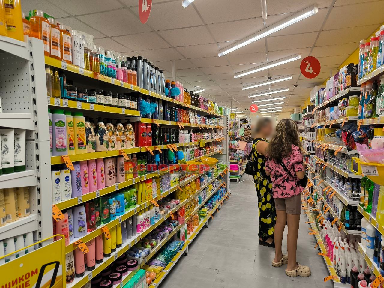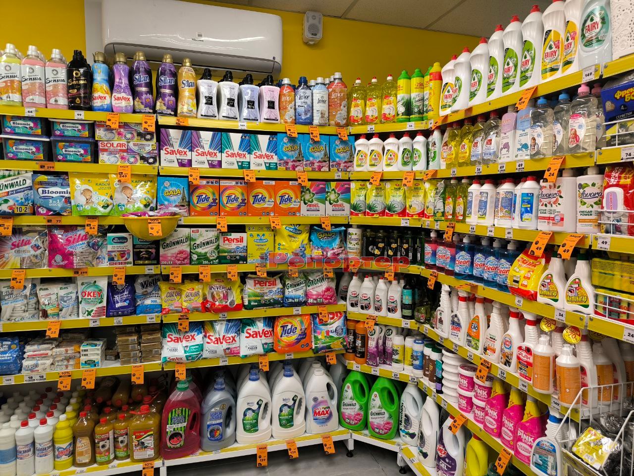 На полицях представлений стандартний набір товарів, який є в крамницях цієї мережі: продукти харчування та напої, канцтовари (актуально перед початком нового навчального року), побутова хімія, зоотовари, посуд, інструменти, техніка, іграшки, аксесуари тощо.