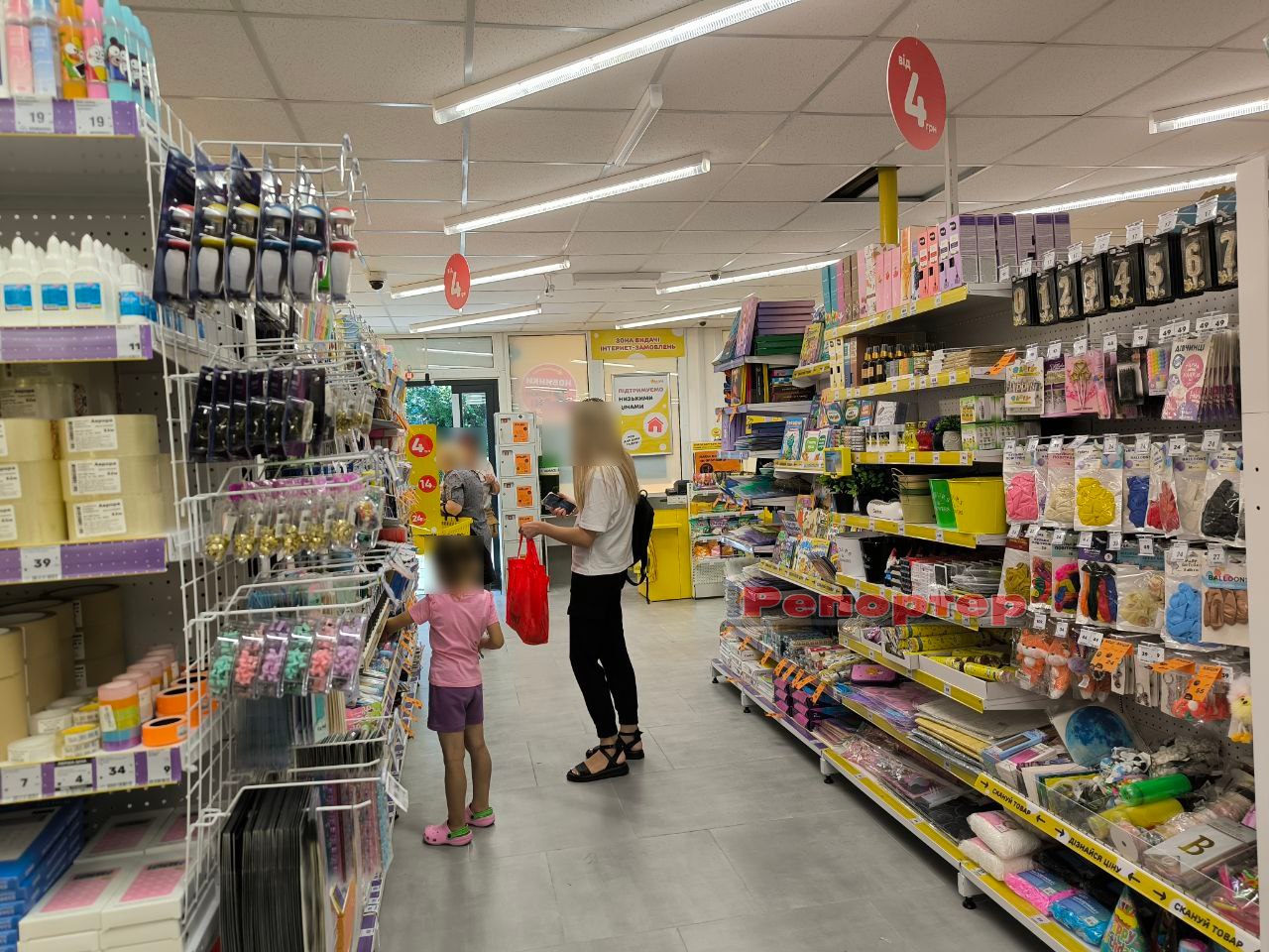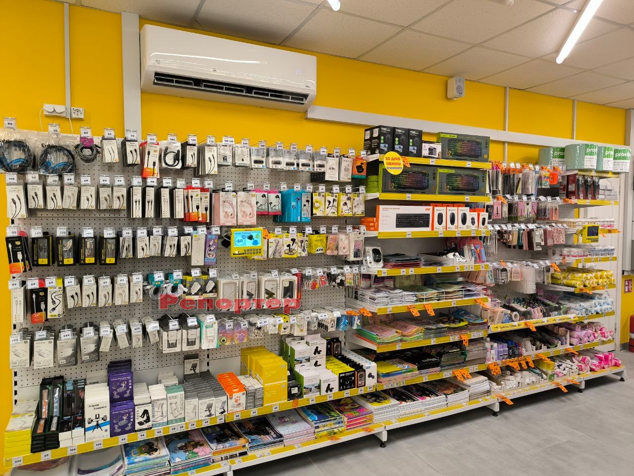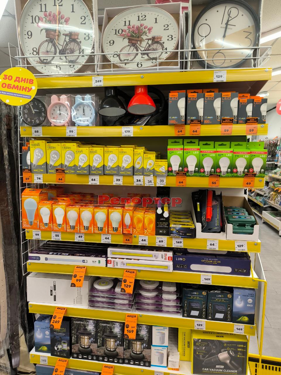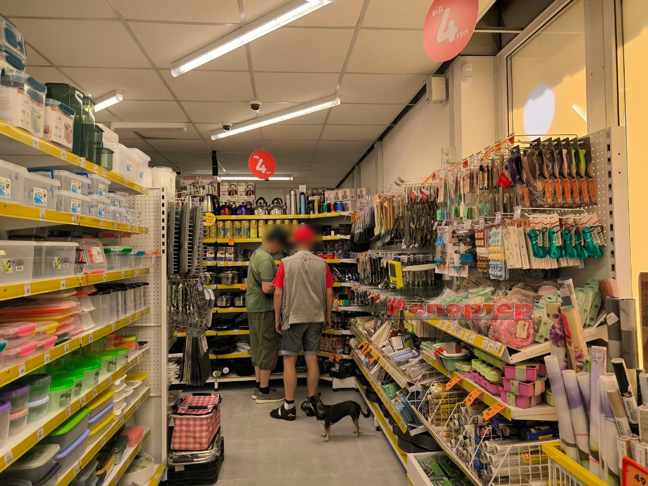 На полицях представлений стандартний набір товарів, який є в крамницях цієї мережі: продукти харчування та напої, канцтовари (актуально перед початком нового навчального року), побутова хімія, зоотовари, посуд, інструменти, техніка, іграшки, аксесуари тощо.
