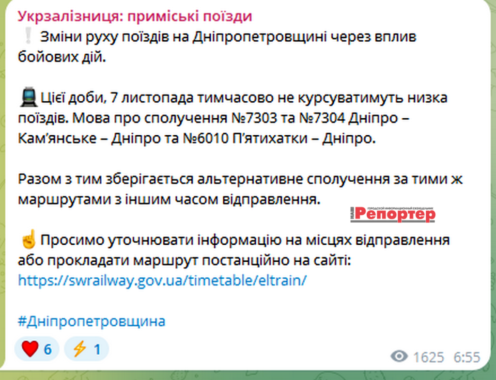 Зокрема, о 06:55 з’явилася інформація, що скасування електричок № 7303 та № 7304 «Дніпро – Кам’янське – Дніпро» і №6010 «П’ятихатки – Дніпро». На жаль, інформацію надано постфактум (після того, як ці електропоїзди мали відправлятися за розкладом).
