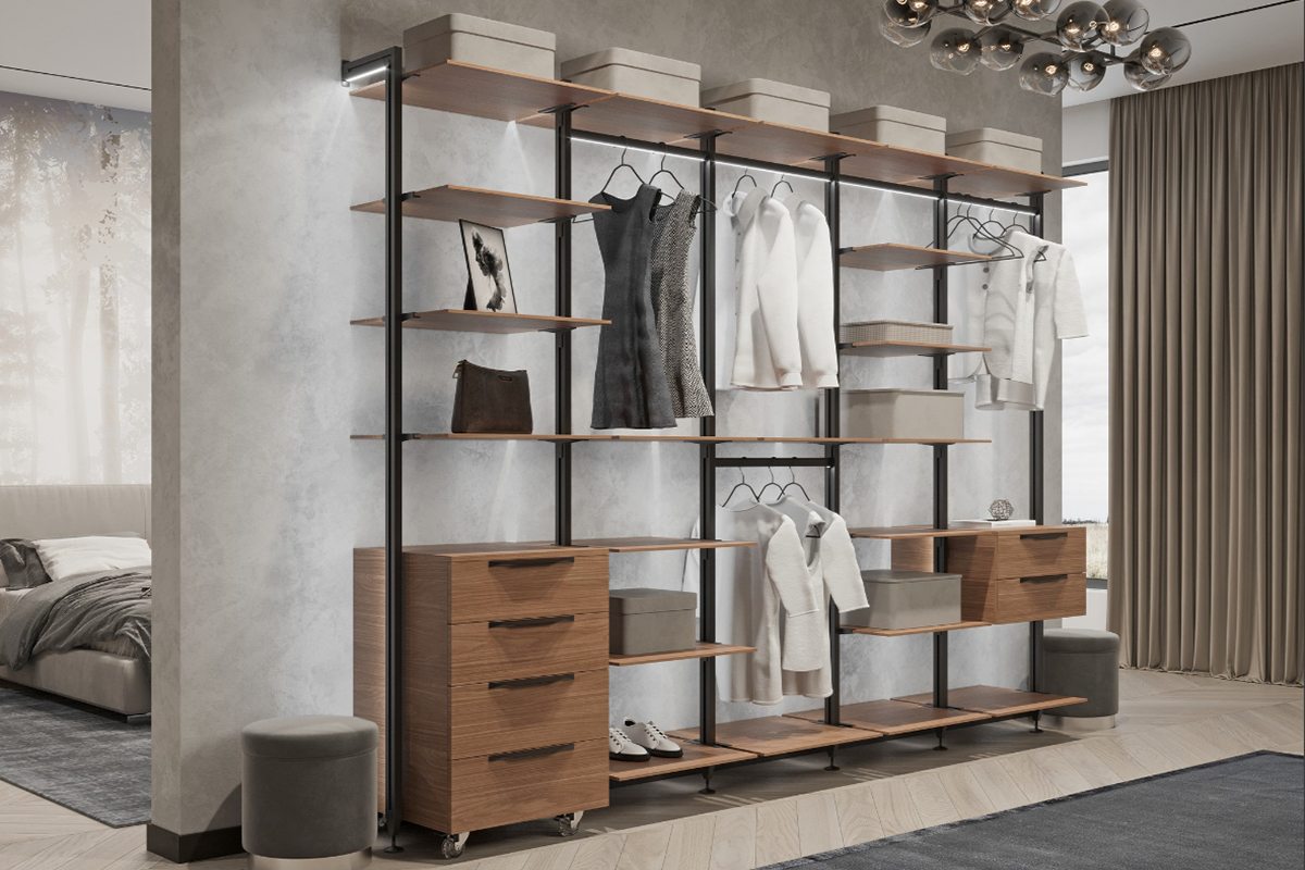 • Наявні різні дизайни та матеріали (ДСП, метал, пластик), відповідно модульні гардеробні системи від економ до преміумсегменту.