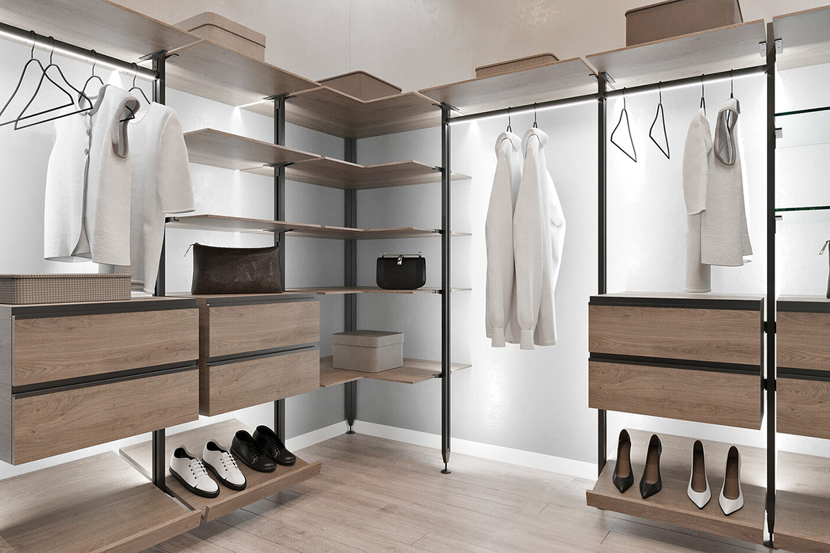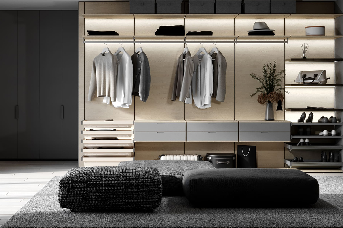 Просто, швидко і недорого – три причини використовувати модульні системи. Гардеробні системи складаються з набору різноманітних секцій (стійок, полиць, ящиків, штанг), які можна поєднувати в довільному порядку. Таким чином, Ви підлаштуєте меблі під параметри приміщення, навіть якщо це маленька гардеробна кімната.