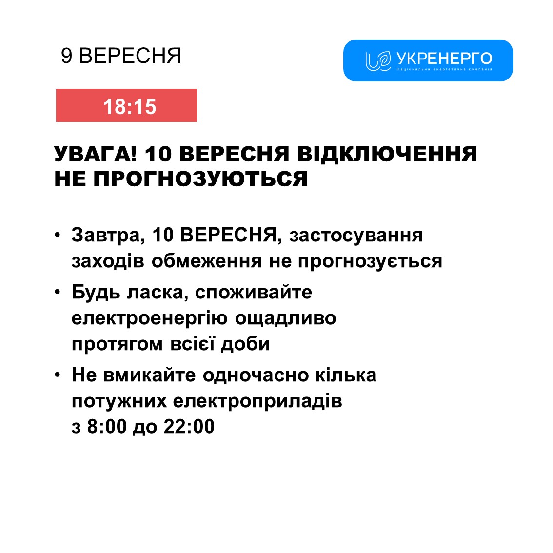У вівторок, 10 вересня, стабілізаційні відключення не прогнозуються, інформують в “Укренерго”.