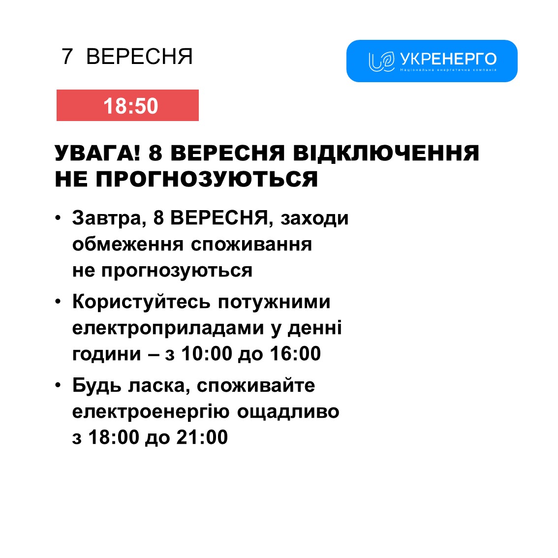 У неділю, 8 вересня, стабілізаційні відключення не прогнозуються, інформують в “Укренерго”.