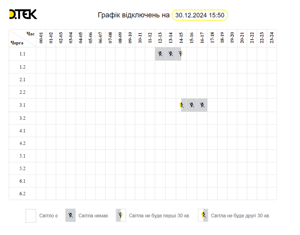 Згідно з інформацією на сайті ДТЕК “Дніпровські електромережі”, 30 грудня буде діяти такий графік відключення