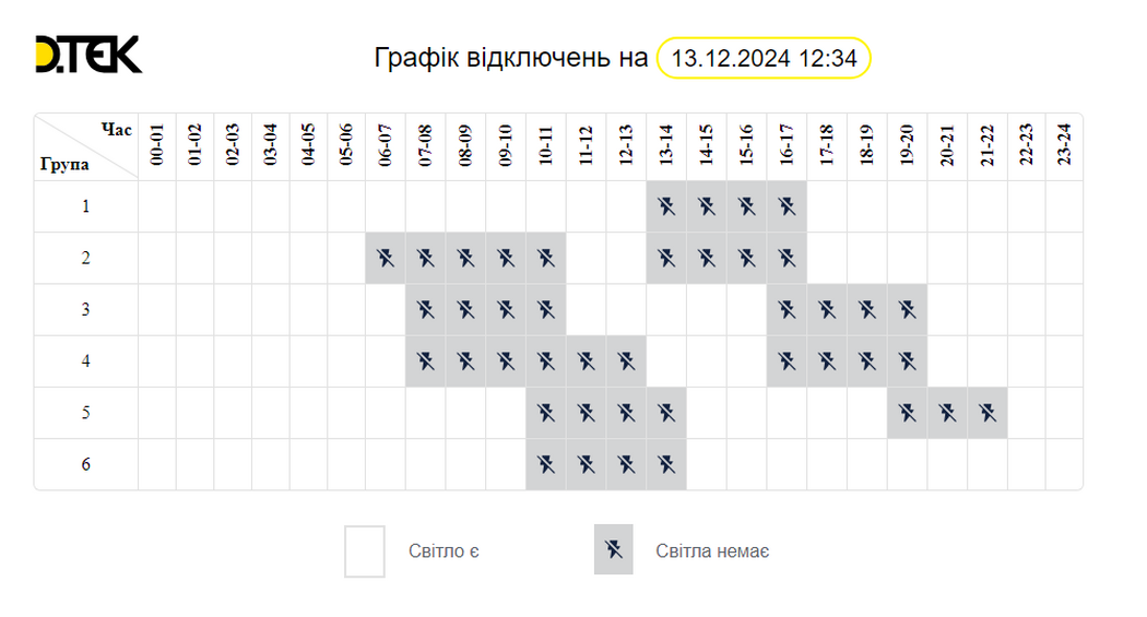 Згідно з інформацією на сайті ДТЕК “Дніпровські електромережі”, 13 грудня буде діяти такий графік відключення (оновлено о 12:34):