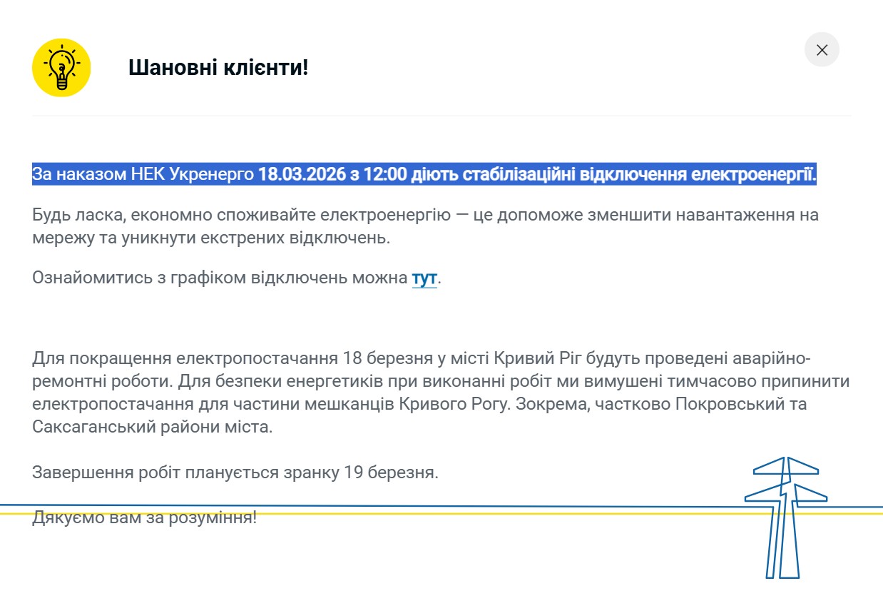 За наказом НЕК “Укренерго” 18 березня з 12:00 діють стабілізаційні відключення електроенергії. Про це повідомили в ДТЕК “Дніпровські електромережі”.