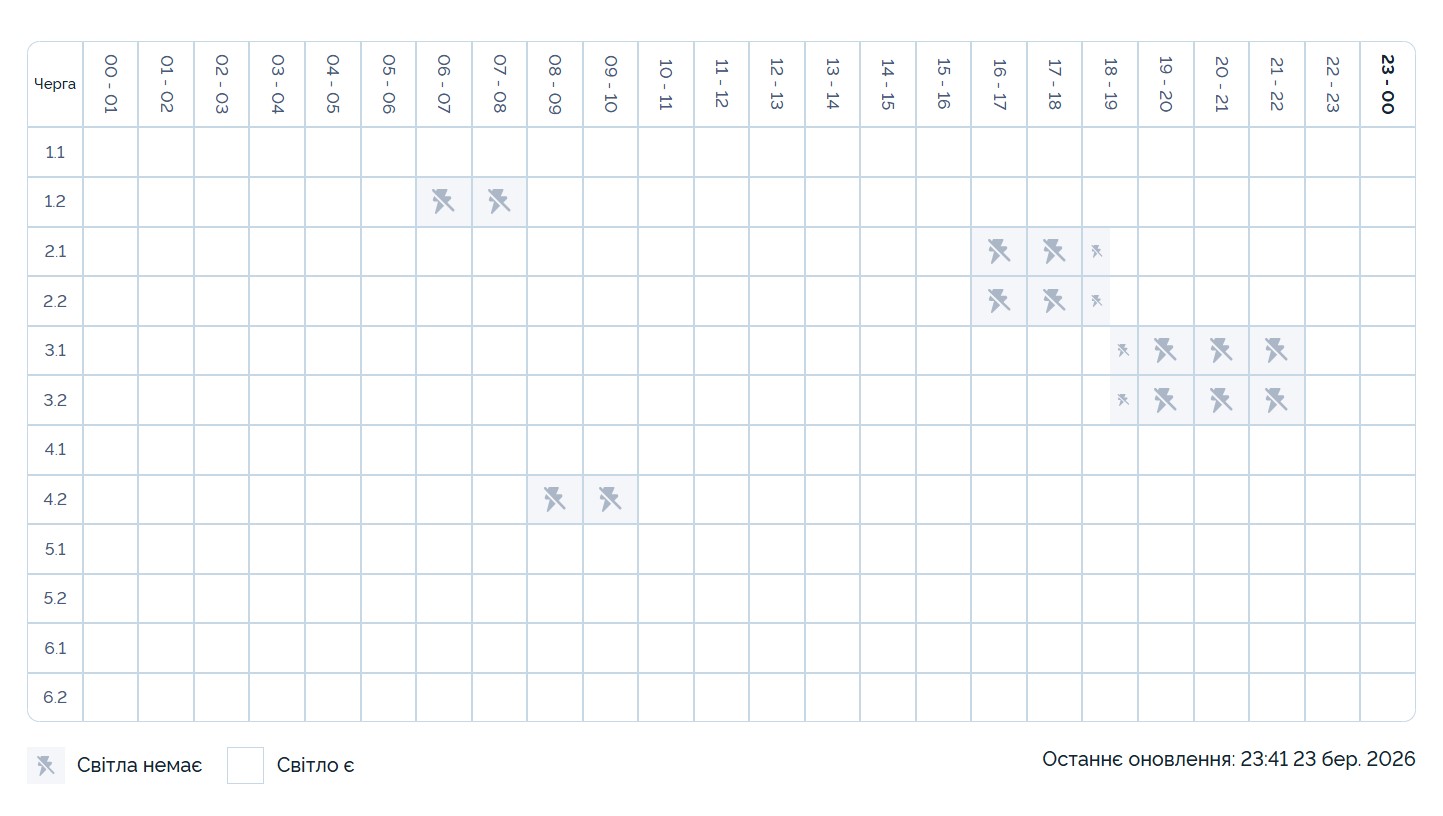 У більшості регіонів України 24 березня з з 06:00 до 10:00 та з 16:00 до 22:00 будуть застосовуватись графіки погодинних відключень світла. Про це повідомили в “Укренерго”.