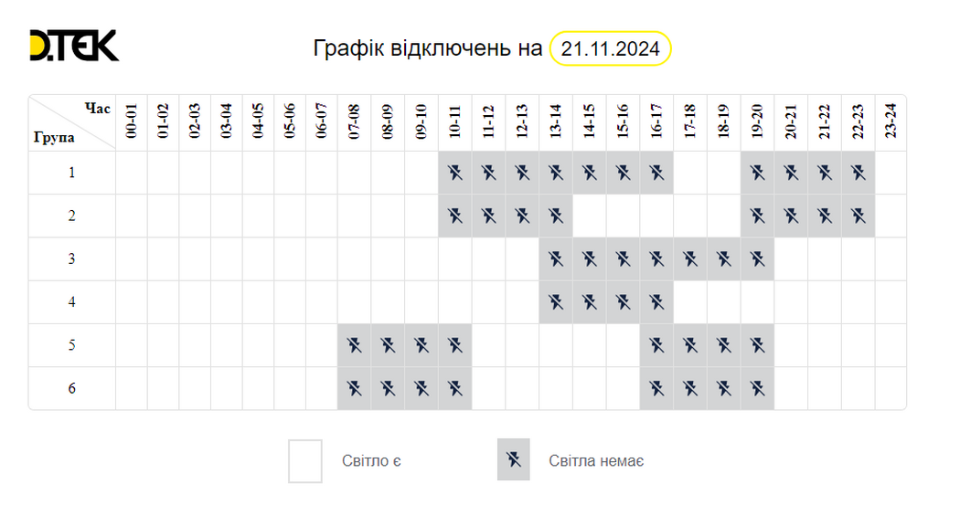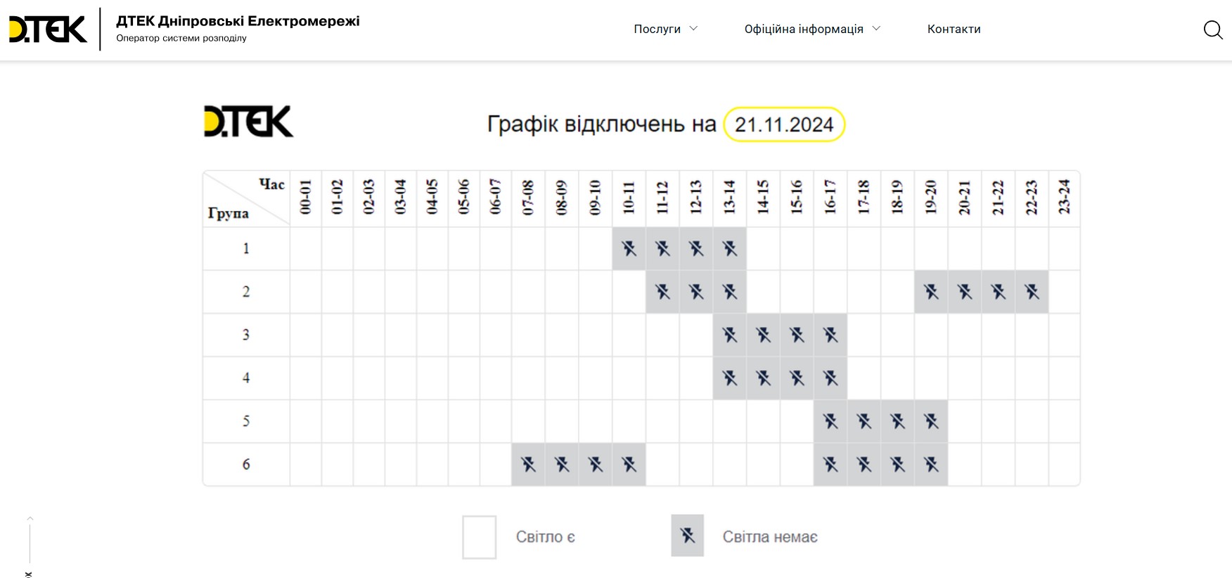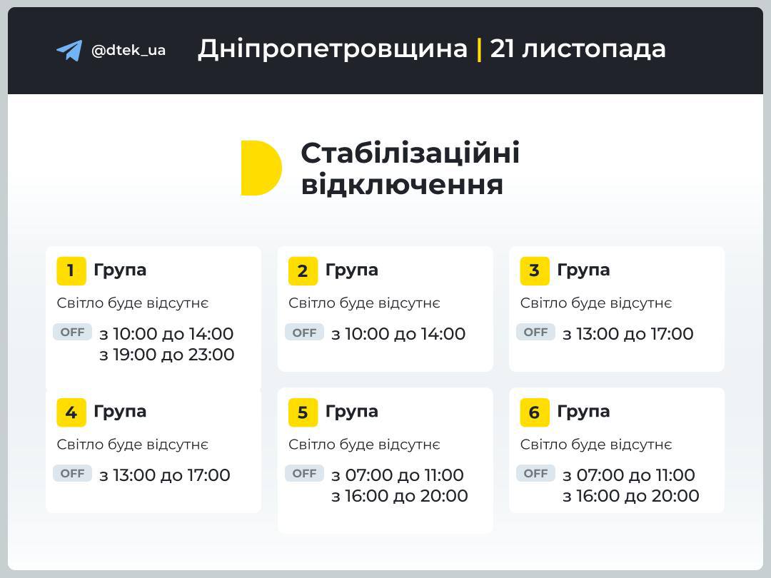 Згідно з інформацією на сайті ДТЕК “Дніпровські електромережі”, 21 листопада буде діяти такий графік відключення: