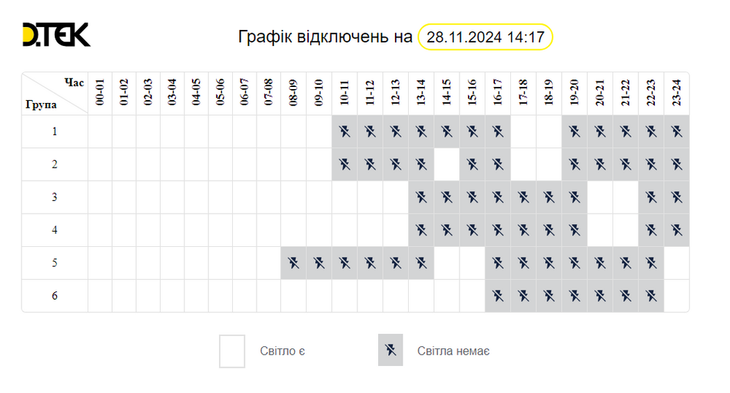 Згідно з інформацією на сайті ДТЕК “Дніпровські електромережі”, 28 листопада буде діяти такий графік відключення (оновлено станом на 14:17):