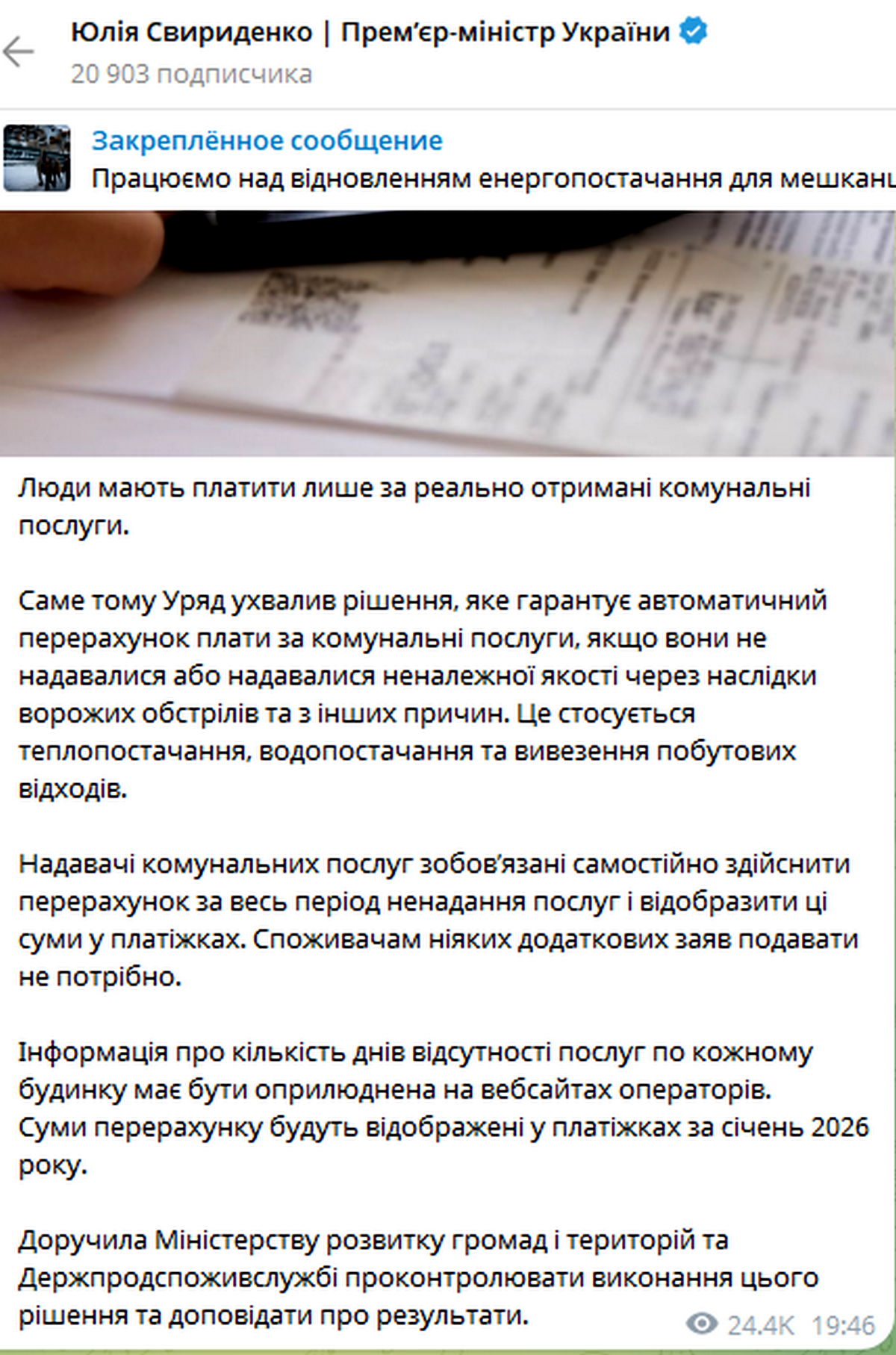 Про це 30 січня повідомила Юлія Свириденко, Прем’єр-міністр України, на своєму телеграм-каналі (https://t.me/svyrydenkoy/1483):