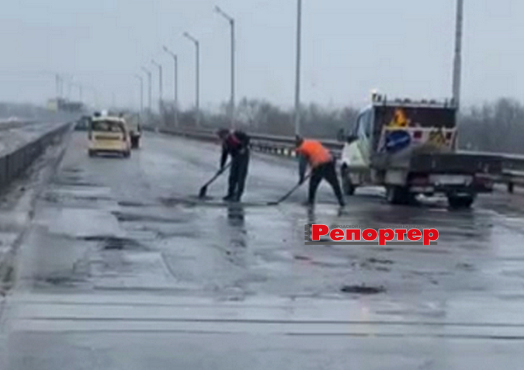 На Новому мосту вже працюють комунальники: частково позначили небезпечні місця, засипають небезпечні ями. Зрозуміло, що це тимчасові заходи, тож, як вже зазначалося міською владою, за наявності погодних умов розпочнуться ремонтні роботи (до речі, протягом зими вони теж виконувалися на найбільш небезпечних ділянках).
