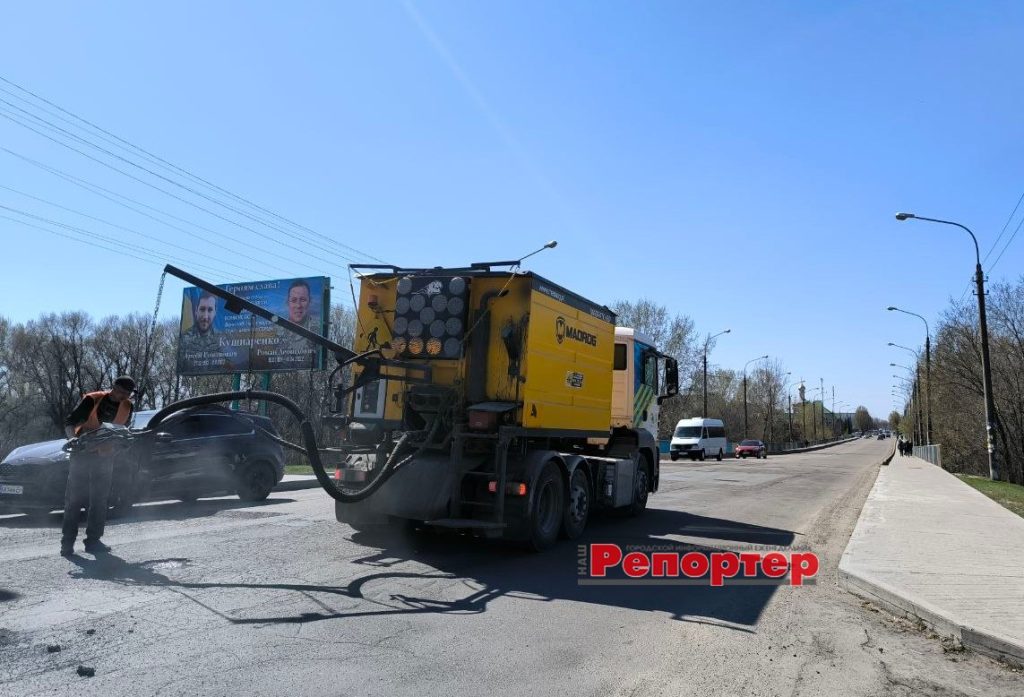 Для вказаних робіт застосовують різну техніку. Сьогодні, 6 квітня, на лівобережжі працювала спецавтівка для ямкового ремонту (ЯР). Досить ефективна для цього виду робіт.