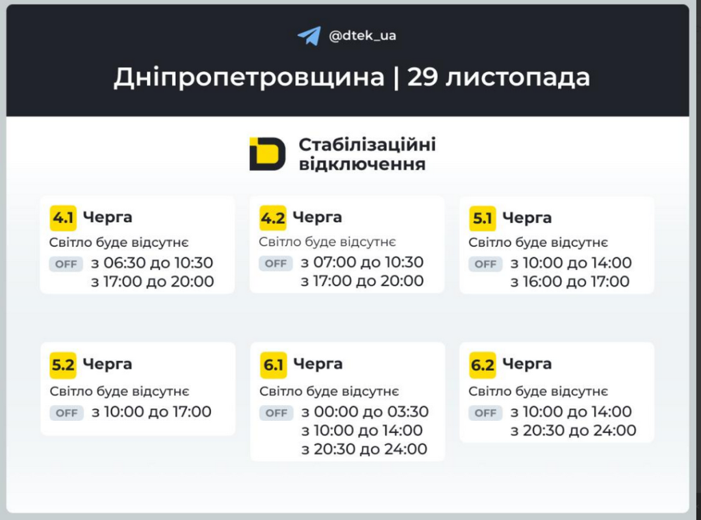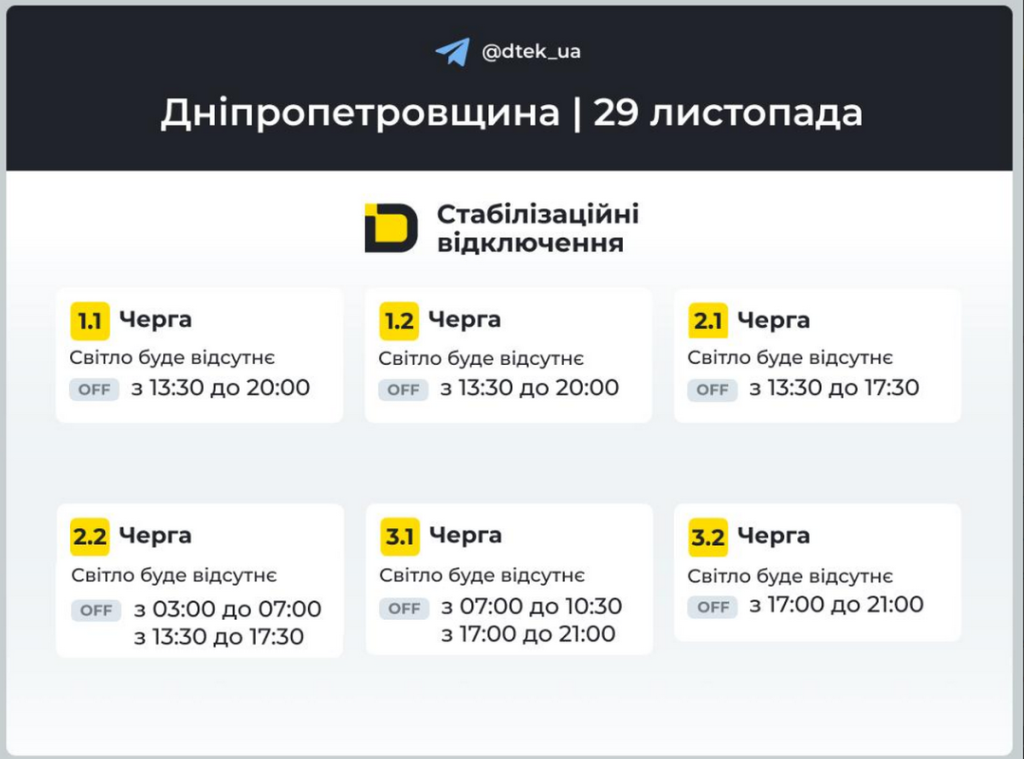 Згідно з інформацією ДТЕК, на Дніпропетровщині діятимуть такі графіки: