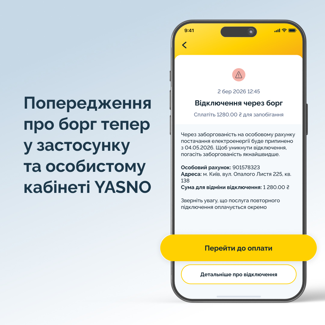 Клієнти YASNO, котрі користуються мобільним застосунком або особистим кабінетом та мають заборгованість, яка є підставою для припинення електропостачання, тепер отримуватимуть офіційне попередження про відключення в цих онлайн-сервісах.
