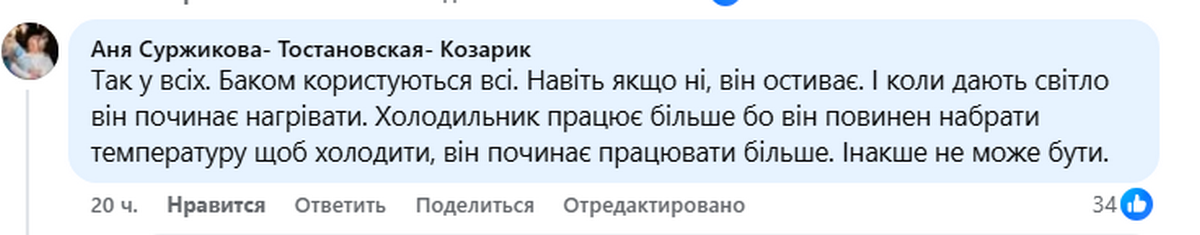 «Режим роботи холодильника залежить від моделі, марки, температури зовнішнього повітря, заповненості морозильних камер тощо. Проте принцип загалом такий: при стабільному електропостачанні агрегат 20 хвилин працює і 20 хвилин відпочиває. Коли ж його включають після тривалої паузи (як у нас буває через 7, а то й 9 годин), щоб набрати необхідний температурний режим, він починає тривалий час працювати без перерв. Відповідно в цей час і електрики він споживає більше».