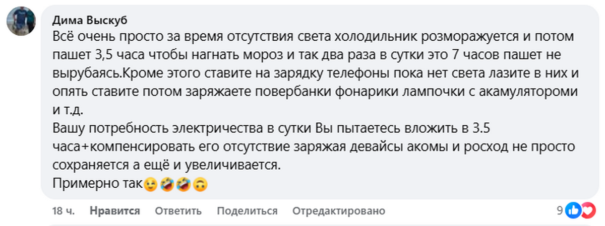 До речі, користувачі електроопалення у розмові з журналістом також підтвердили, що електробатареї (після тривалих періодів відсутності світла) теж починають працювати без відключення, поки прогріють приміщення до заданої температури. А значить витрата електрики тим часом значно зростає.