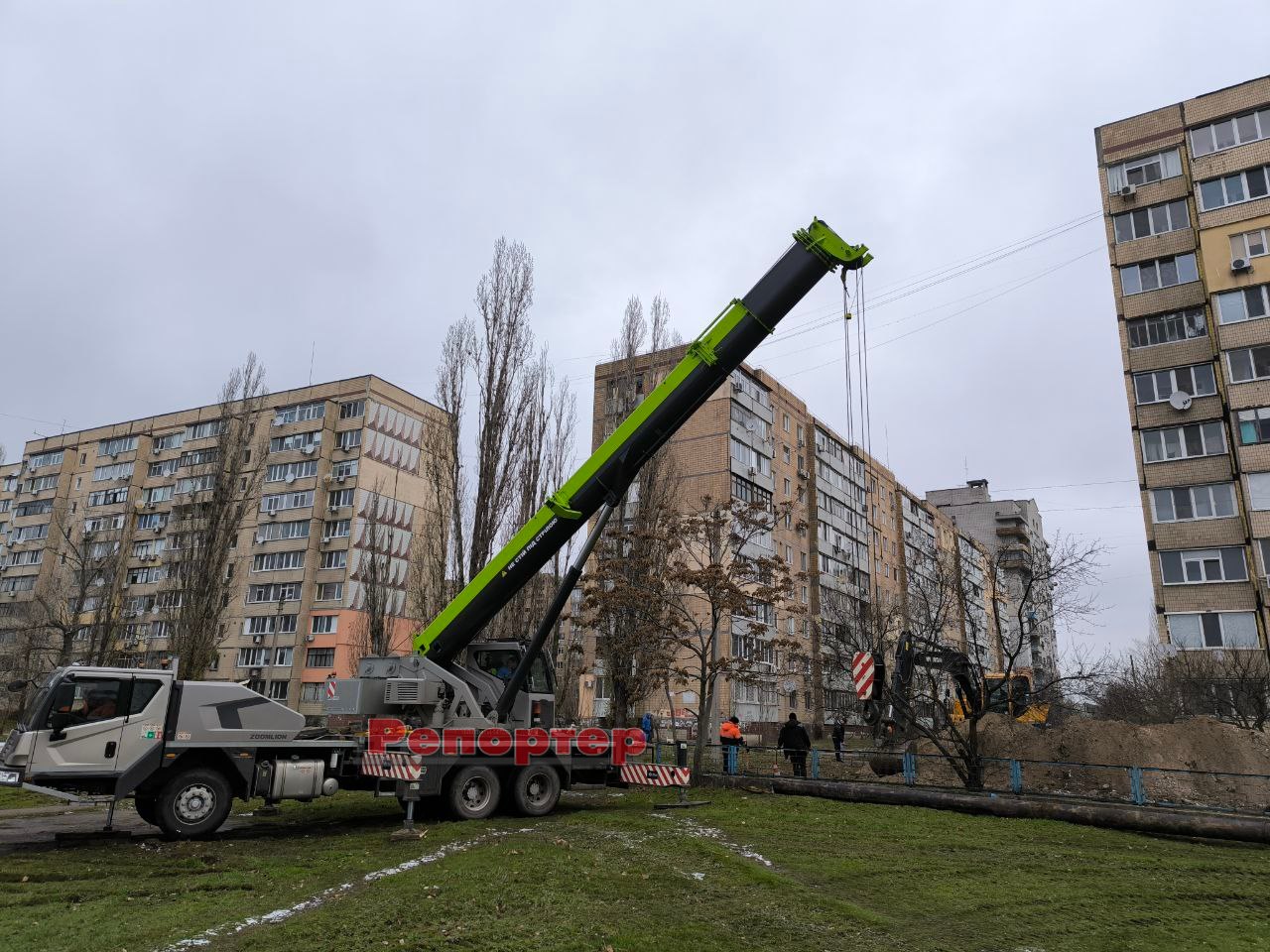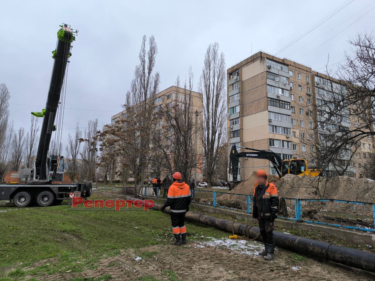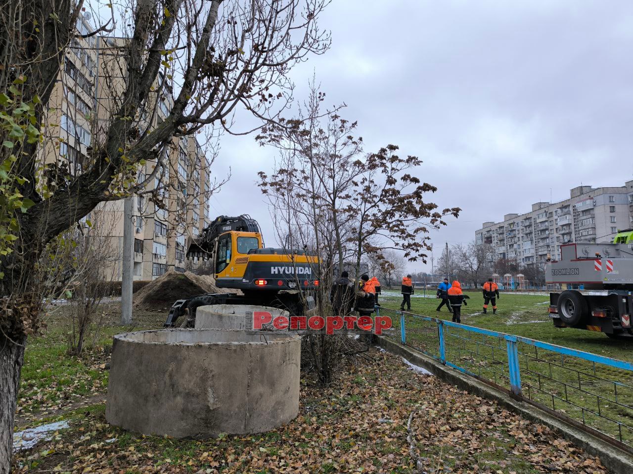 Бригада комунального підприємства працює на проспекті Нескорених / Перемоги, що на Лівобережжі у Кам’янському (біля ліцею № 40). На місці, де було вирито траншею, залучили важку техніку (автокран, екскаватор, бригадний автомобіль тощо).