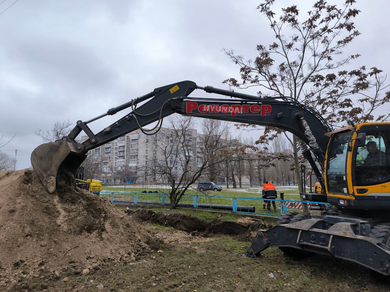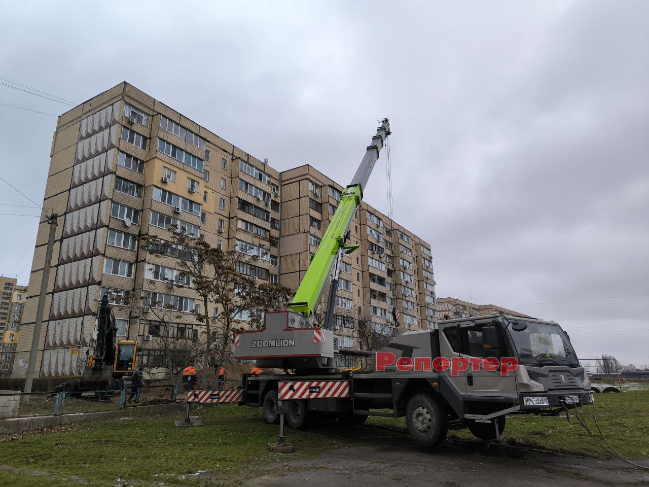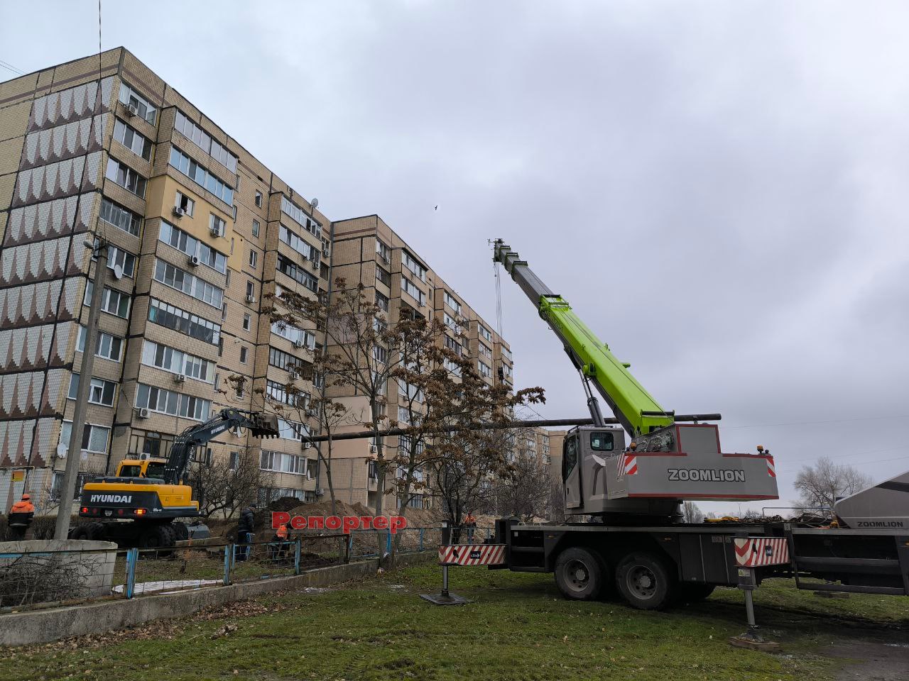 Бригада комунального підприємства працює на проспекті Нескорених / Перемоги, що на Лівобережжі у Кам’янському (біля ліцею № 40). На місці, де було вирито траншею, залучили важку техніку (автокран, екскаватор, бригадний автомобіль тощо).