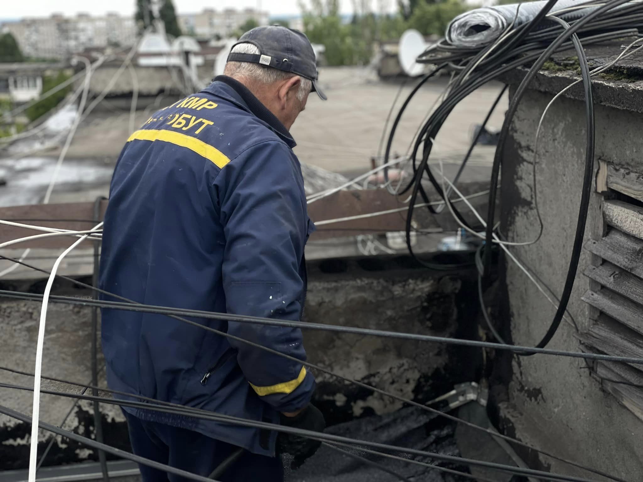 Робітники оновлюють покрівлю на вул. Є. Мельнікова, 18.