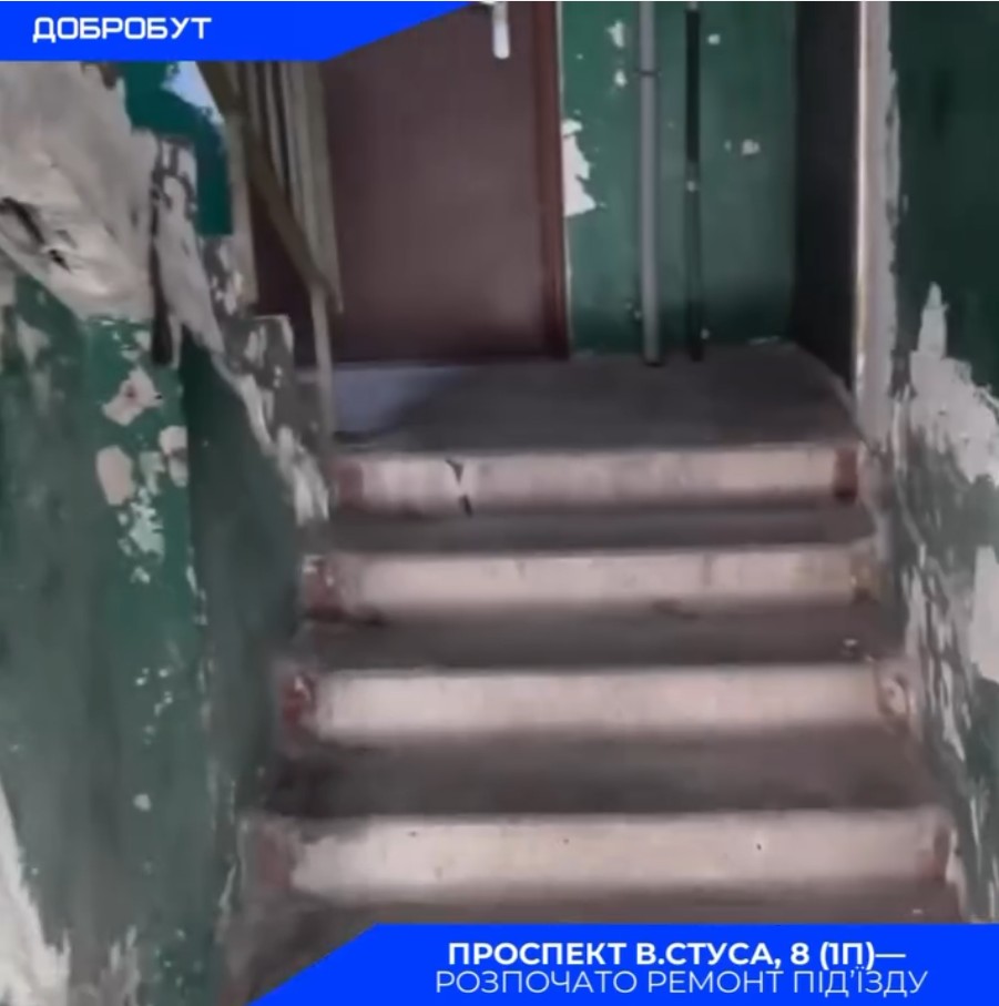 Розпочато ремонт першого під’їзду на пр. Василя Стуса, 8. Роботи виконуватимуться поетапно, згідно із затвердженим планом.