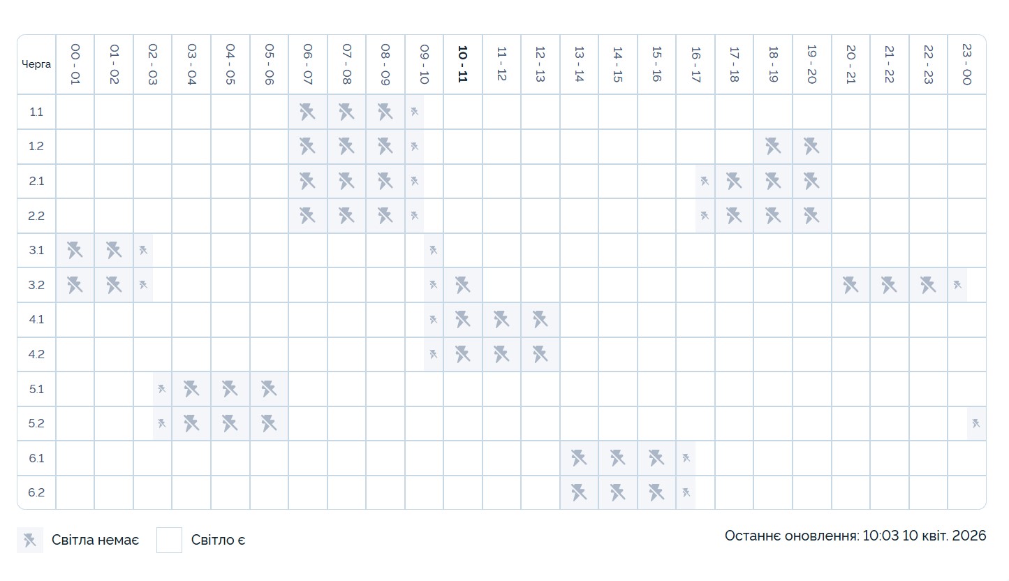 В усіх регіонах України 10 квітня застосовано графіки погодинних відключень світла. Про це повідомили в “Укренерго”.